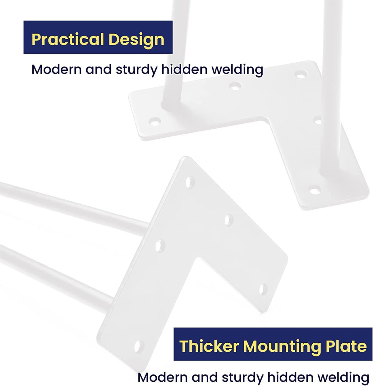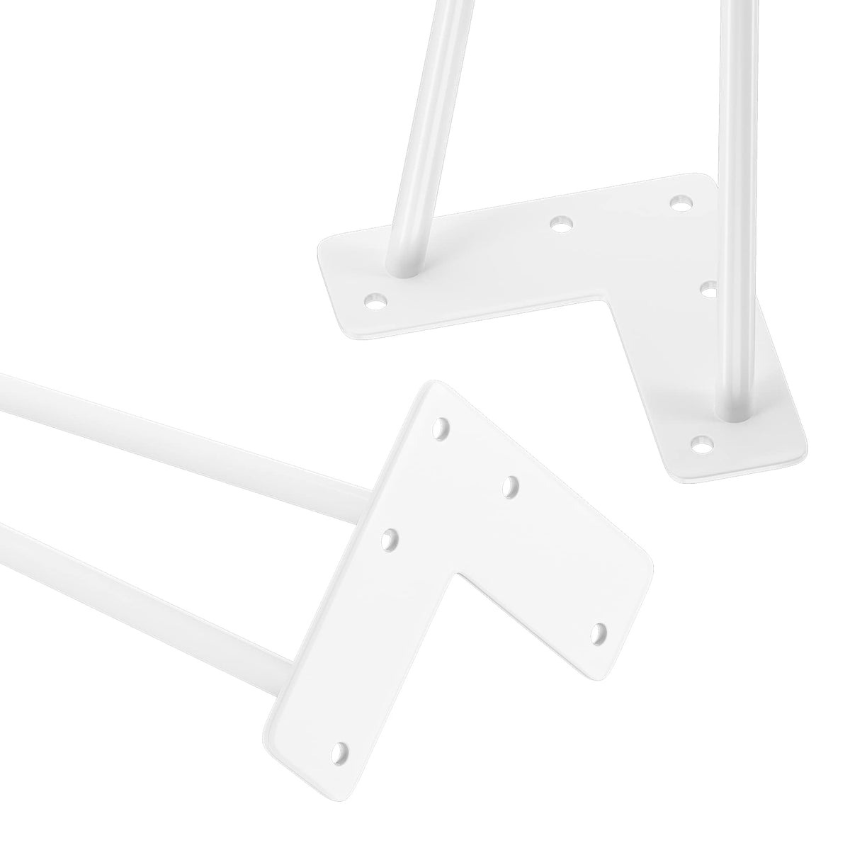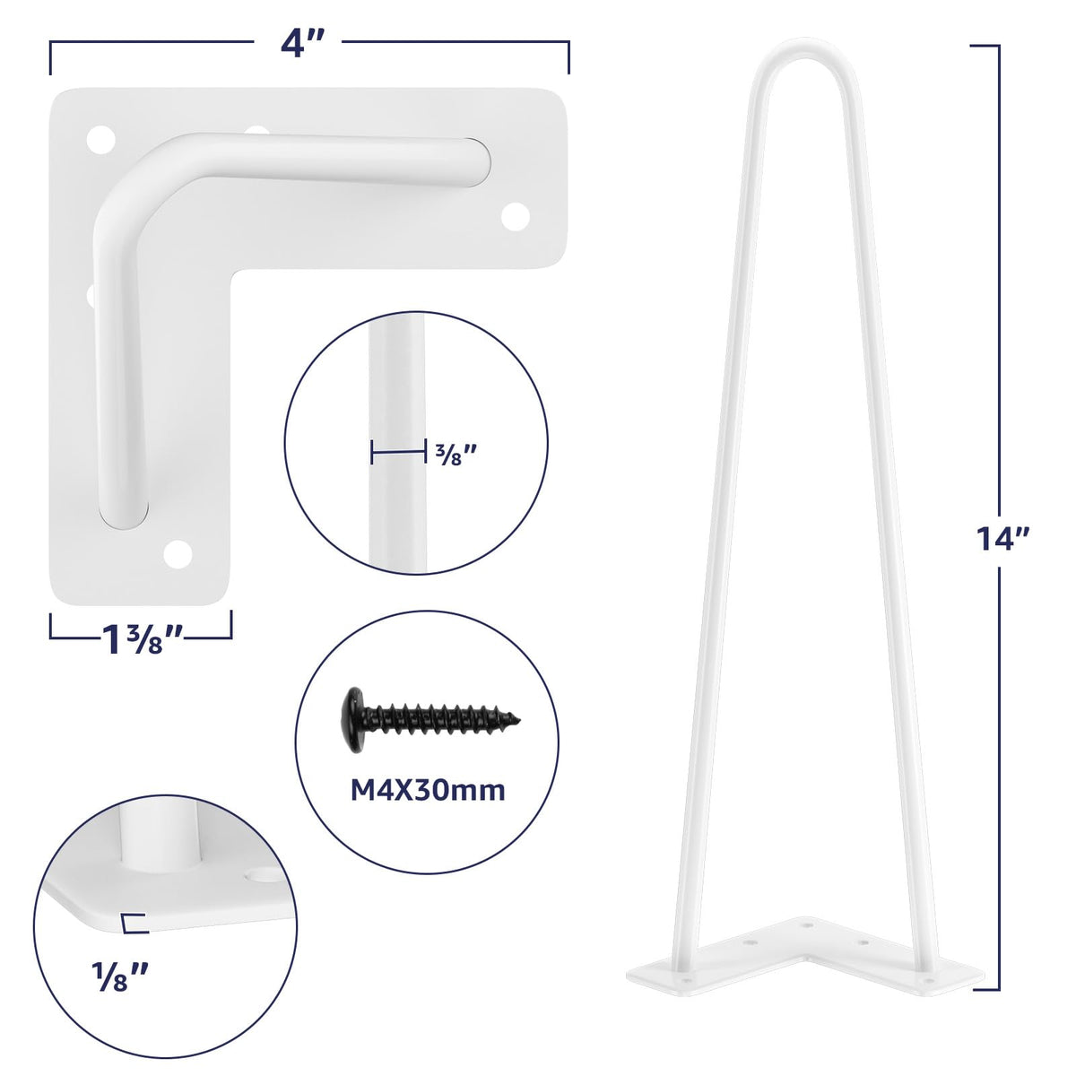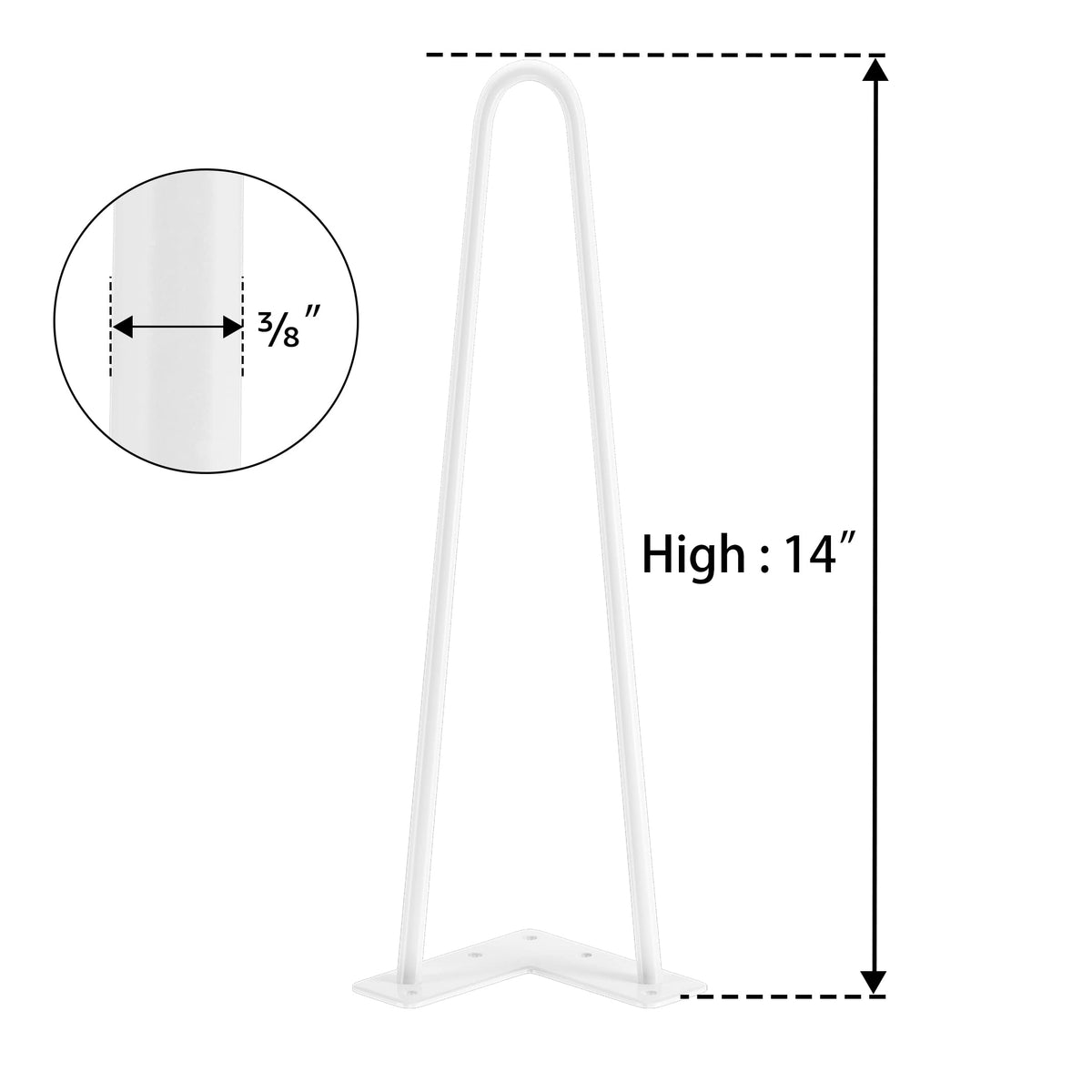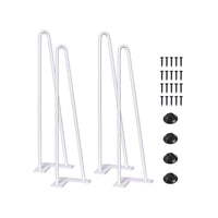 Additional Floor Protectors: When you purchase a set of mid-century modern legs you’ll also get a set of rubber feet! Use them to protect your floors from damage or as an added stabilizer for that wobbly chair or table. | DIY Project: Mount these 14-inch legs (set of 4) with the tabletop of your choice To create a kind of industrial modern piece. You can create something by adding a new level of decor to your space, with the flexibility to make the piece your own style. | Mounting Bracket Pre-drilled for Easy Installation: The mounting bracket is pre-drilled with 5 holes for quick assembly. The mounting plate measures 4 inches long x 1 7/8 inch wide x 1/8 inch thick. | Made of Heavy Duty Solid Steel: These Hairpin legs are made of 3/8'' cold Rolled sturdy steel. The heavy-duty legs come with a White powder-coated finish and will support up to 300 lbs. | Designed for Versatility: With a sleek, mid-century modern look, our industrial table legs are suited for desks, benches, and any piece of furniture in between! Finished with powder coating technology, the legs are glossy and smooth to the touch.