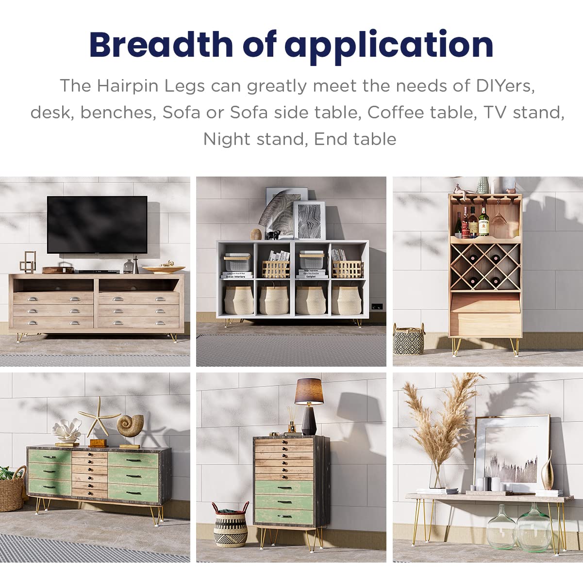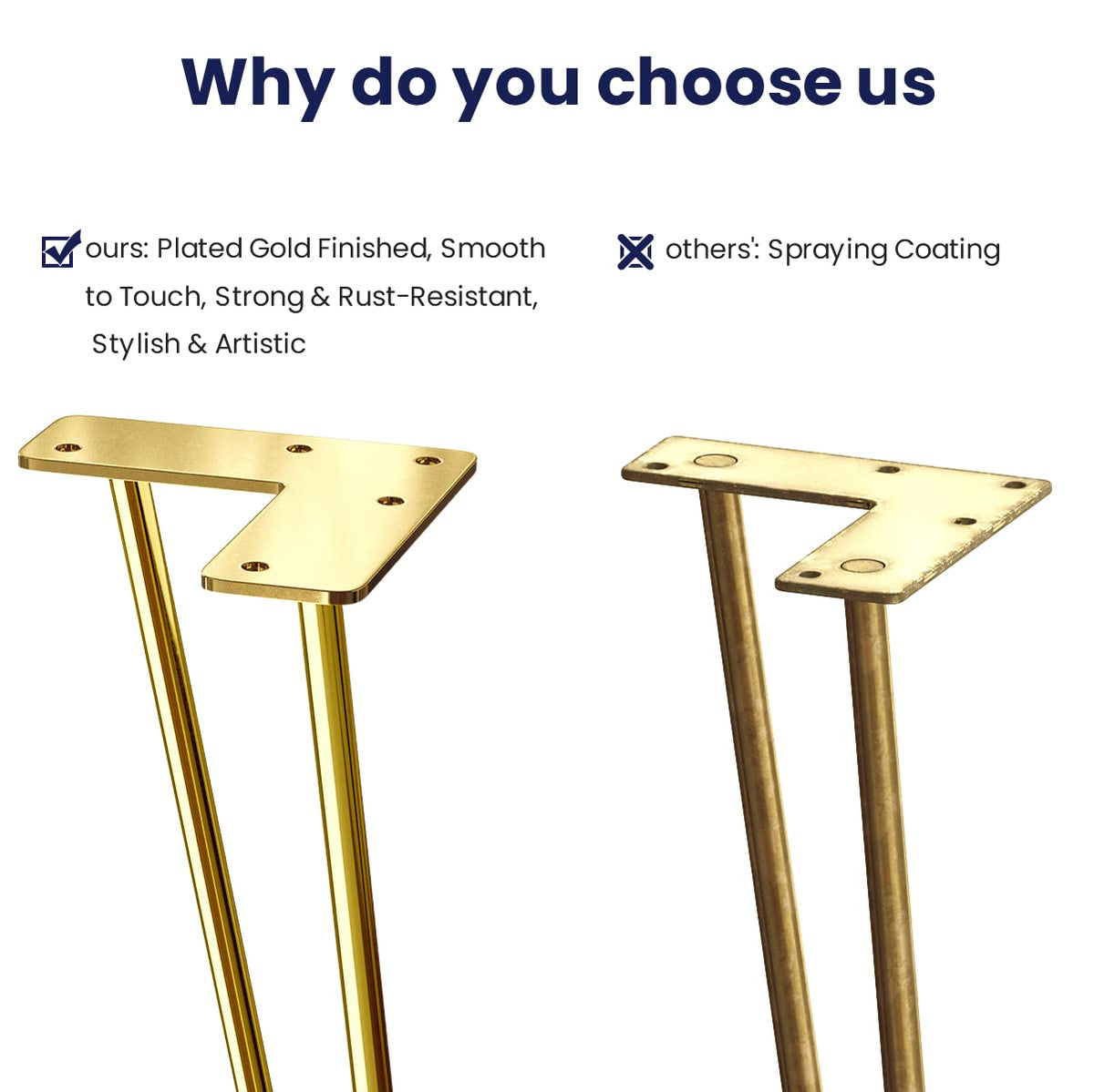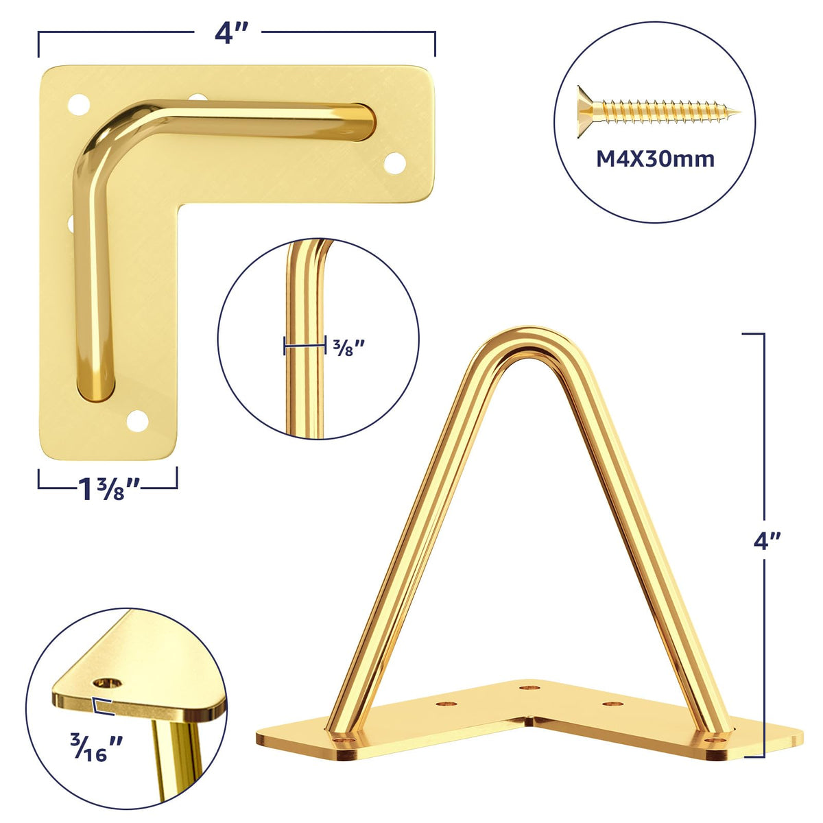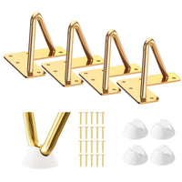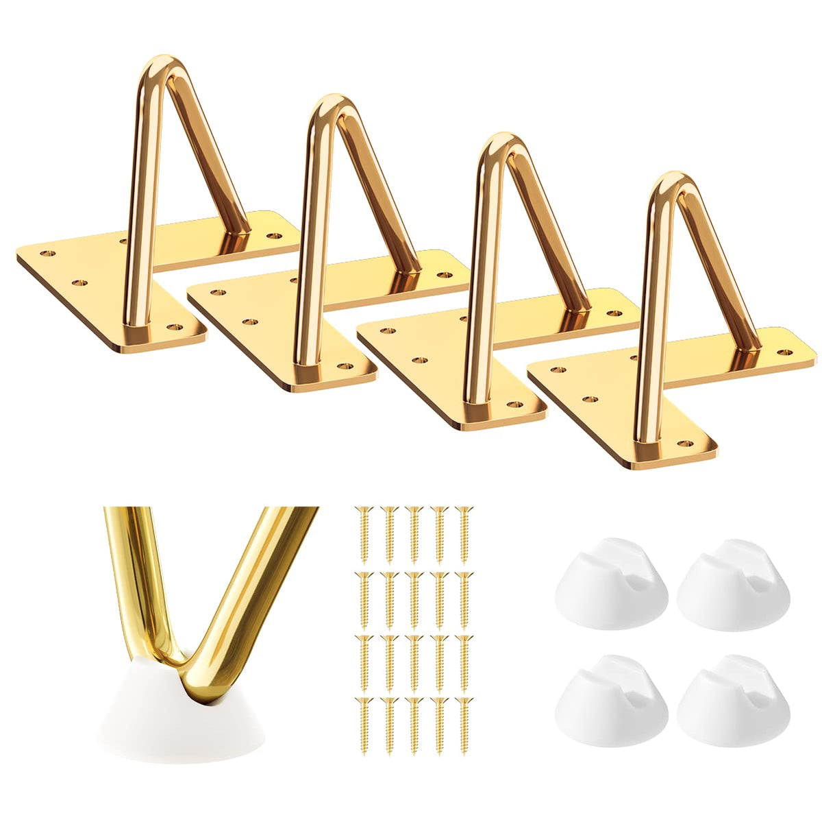 ADDITIONAL FLOOR PROTECTORS: When you purchase a set of mid-century modern legs you’ll also get a set of rubber feet! Use them to protect your floors from damage or as an added stabilizer for that wobbly chair or table. | MATERIALS: These hairpin legs are made of 3/8'' cold rolled sturdy steel. The heavy-duty legs come with a polished gold finish and will support up to 300 lbs. | EASY INSTALLATION: The mounting bracket is pre-drilled with 5 holes for quick assembly. The mounting plate measures 4 inches long x 1 7/8 inch wide x 1/8 inch thick. | STYLISH DIY PROJECT: Mount these 4-inch legs (set of 4) with the tabletop of your choice to create a kind of industrial modern piece. You can create something by adding a new level of decor to your space, with the flexibility to make the piece your own style. | UNIQUE DECORATION: With a sleek, mid-century modern look, our industrial table legs are suited for desks, benches, and any piece of furniture in between! It's a definitely great gift to craft lovers.