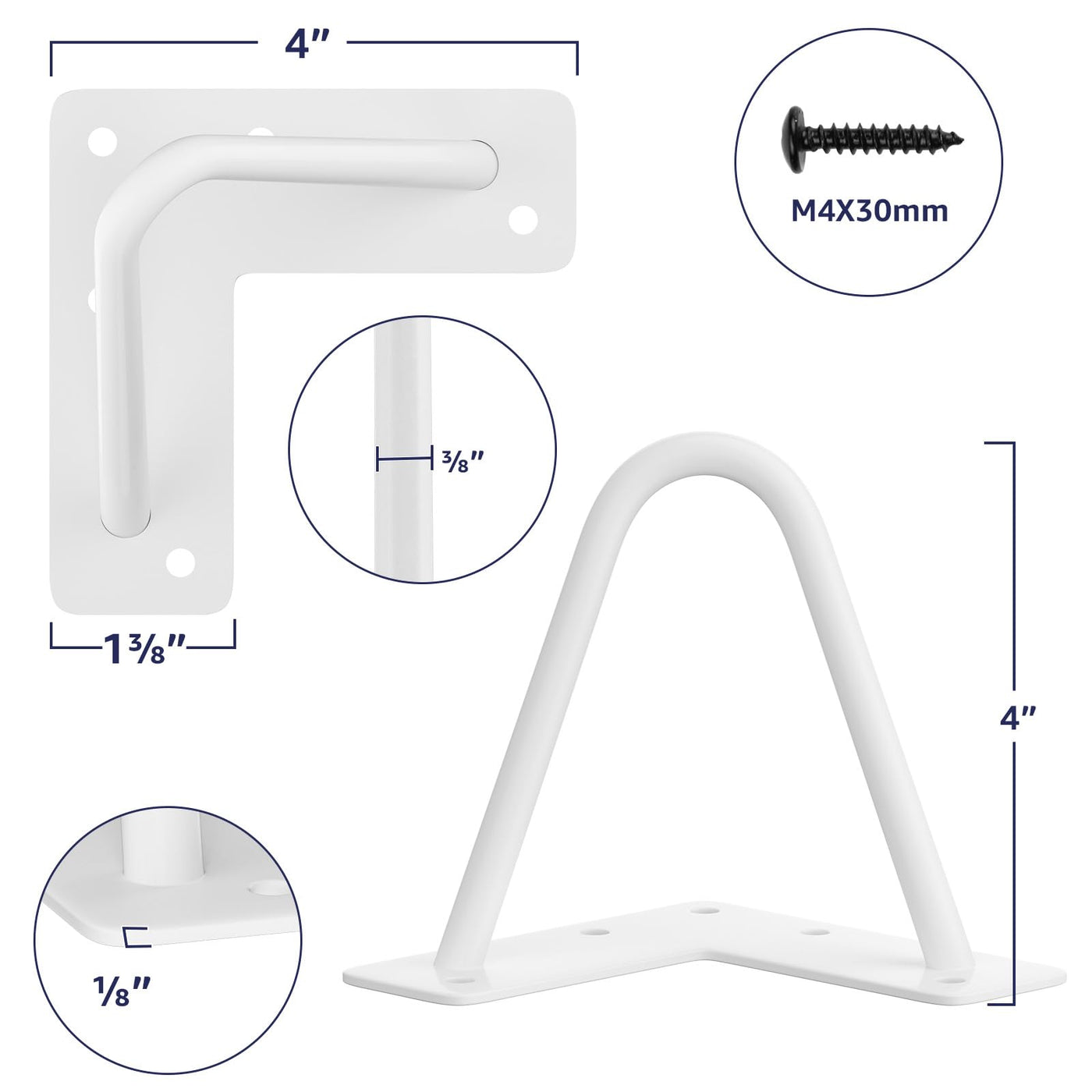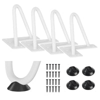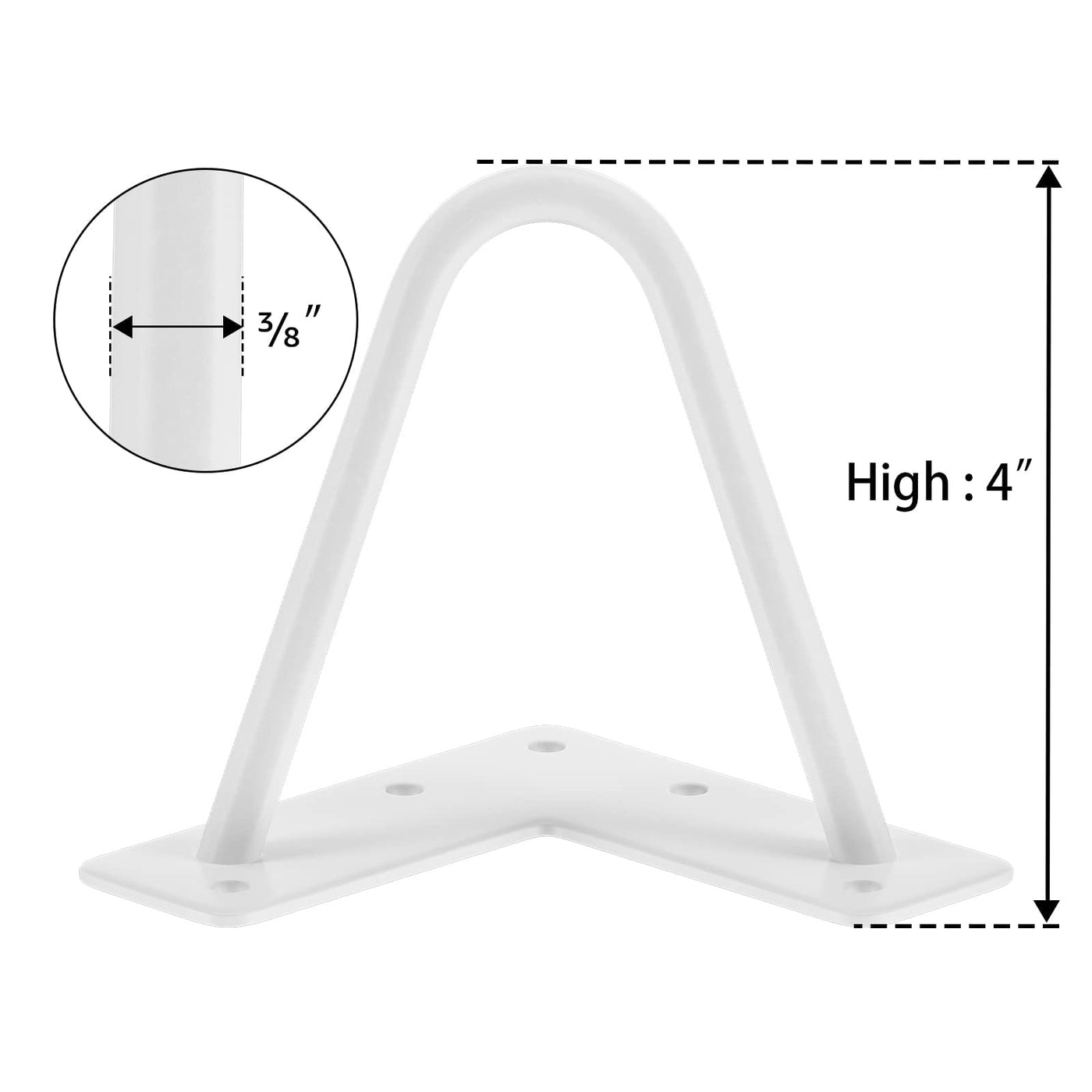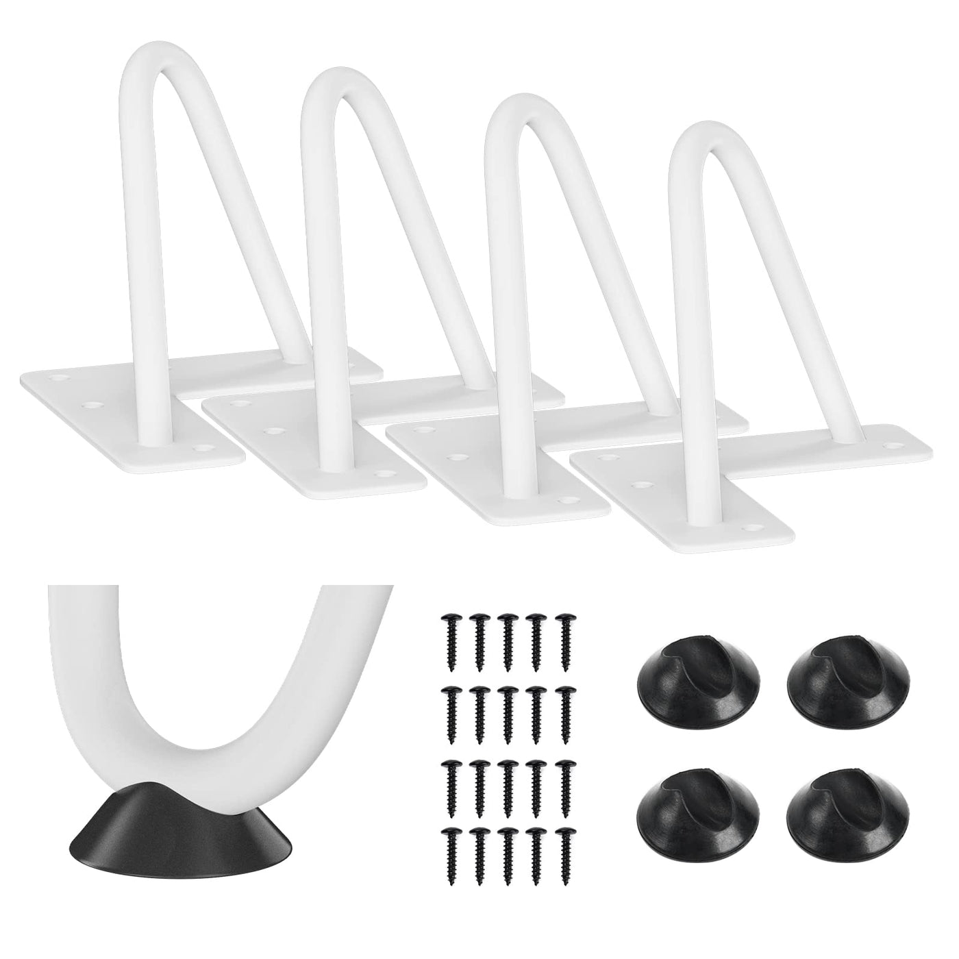 Additional Floor Protectors: When you purchase a set of mid-century modern legs you’ll also get a set of rubber feet! Use them to protect your floors from damage or as an added stabilizer for that wobbly chair or table. | DIY Project: Mount these 4-inch legs (set of 4) with the tabletop of your choice To create a kind of industrial modern piece. You can create something by adding a new level of decor to your space, with the flexibility to make the piece your own style. | Mounting Bracket Pre-drilled for Easy Installation: The mounting bracket is pre-drilled with 5 holes for quick assembly. The mounting plate measures 4 inches long x 1 7/8 inch wide x 1/8 inch thick. | Made of Heavy Duty Solid Steel: These Hairpin legs are made of 3/8'' cold Rolled sturdy steel. The heavy-duty legs come with a White powder-coated finish and will support up to 300 lbs. | Designed for Versatility: With a sleek, mid-century modern look, our industrial table legs are suited for desks, benches, and any piece of furniture in between! Finished with powder coating technology, the legs are glossy and smooth to the touch.