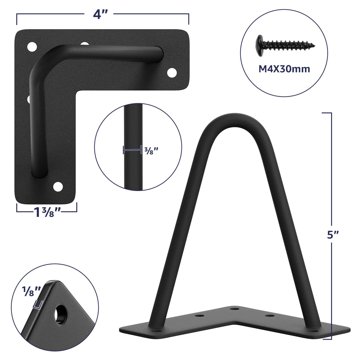 Additional Floor Protectors: When you purchase a set of mid-century modern legs you’ll also get a set of rubber feet! Use them to protect your floors from damage or as an added stabilizer for that wobbly chair or table. | DIY Project: Mount these 5-inch legs (set of 4) with the tabletop of your choice To create a kind of industrial modern piece. You can create something by adding a new level of decor to your space, with the flexibility to make the piece your own style. | Mounting Bracket Pre-drilled for Easy Installation: The mounting bracket is pre-drilled with 5 holes for quick assembly. The mounting plate measures 4 inches long x 1 7/8 inch wide x 1/8 inch thick. | Made of Heavy Duty Solid Steel: These Hairpin legs are made of 3/8'' cold Rolled sturdy steel. The heavy-duty legs come with a Satin Black powder-coated finish and will support up to 300 lbs. | Designed for Versatility: With a sleek, mid-century modern look, our industrial table legs are suited for desks, benches, and any piece of furniture in between! Finished with powder coating technology, the legs are glossy and smooth to the touch.