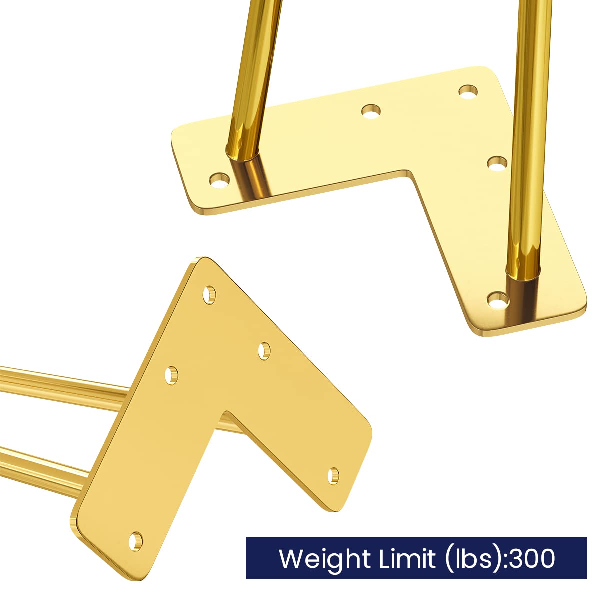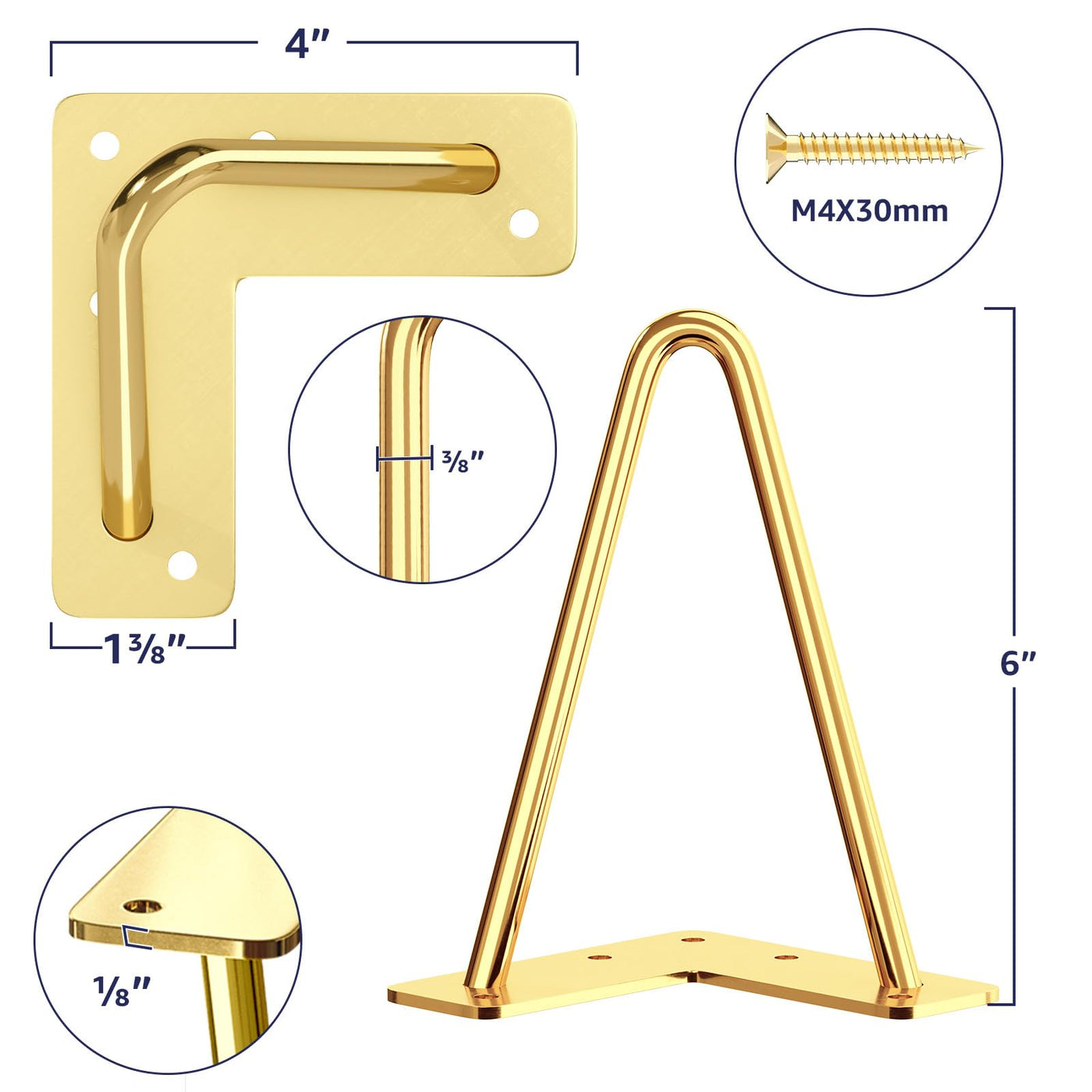 ADDITIONAL FLOOR PROTECTORS: When you purchase a set of mid-century modern legs you’ll also get a set of rubber feet! Use them to protect your floors from damage or as an added stabilizer for that wobbly chair or table. | MATERIALS: These hairpin legs are made of 3/8'' cold rolled sturdy steel. The heavy-duty legs come with a polished gold finish and will support up to 300 lbs. | EASY INSTALLATION: The mounting bracket is pre-drilled with 5 holes for quick assembly. The mounting plate measures 4 inches long x 1 7/8 inch wide x 1/8 inch thick. | STYLISH DIY PROJECT: Mount these 6-inch legs (set of 4) with the tabletop of your choice to create a kind of industrial modern piece. You can create something by adding a new level of decor to your space, with the flexibility to make the piece your own style. | UNIQUE DECORATION: With a sleek, mid-century modern look, our industrial table legs are suited for desks, benches, and any piece of furniture in between! It's a definitely great gift to craft lovers.