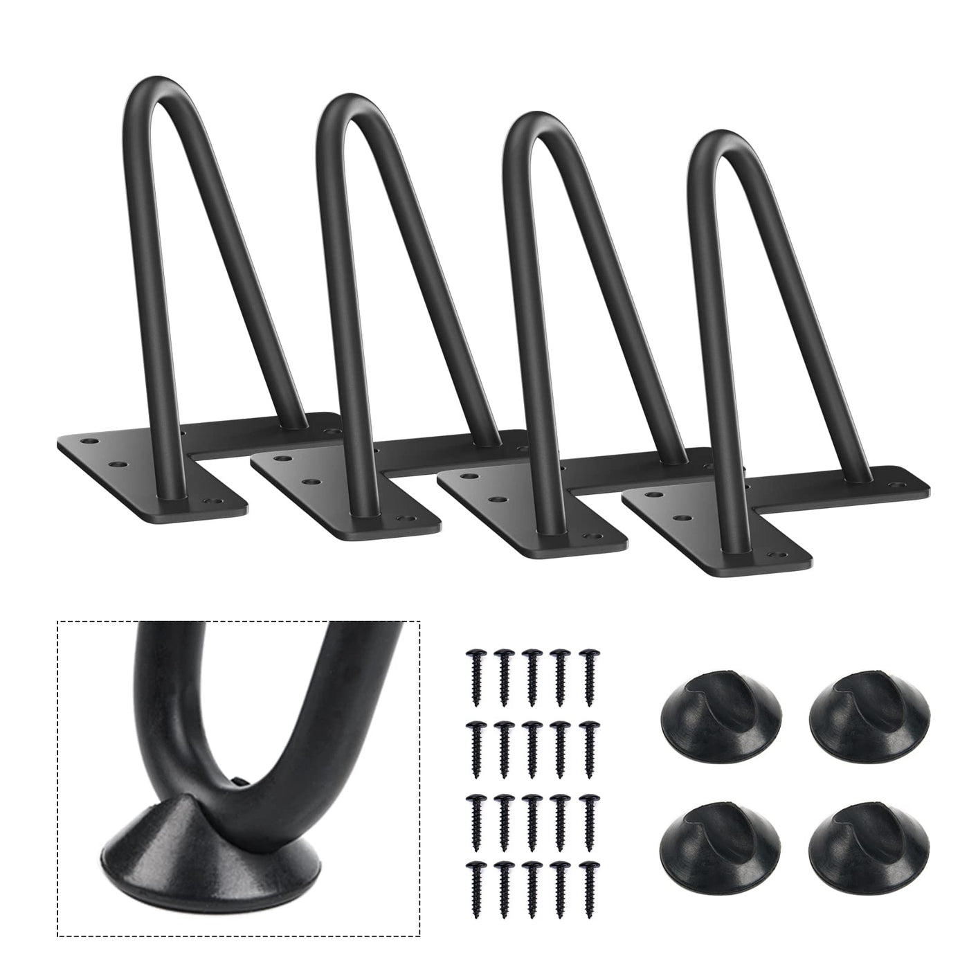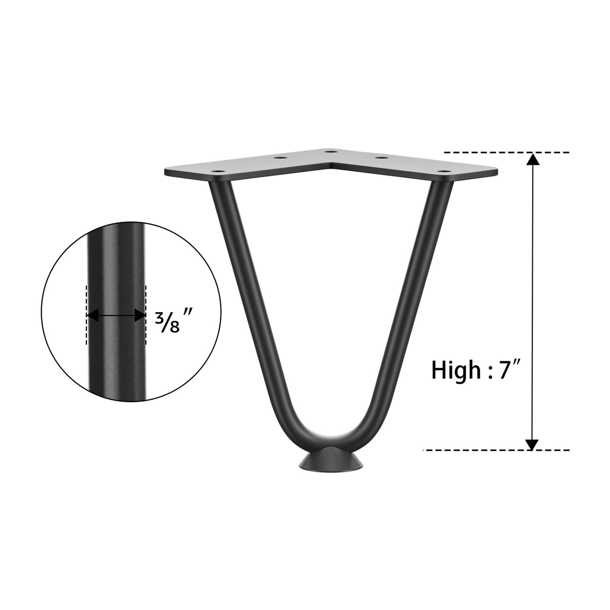 Additional Floor Protectors: When you purchase a set of mid-century modern legs you’ll also get a set of rubber feet! Use them to protect your floors from damage or as an added stabilizer for that wobbly chair or table. | DIY Project: Mount these 7-inch legs (set of 4) with the tabletop of your choice To create a kind of industrial modern piece. You can create something by adding a new level of decor to your space, with the flexibility to make the piece your own style. | Mounting Bracket Pre-drilled for Easy Installation: The mounting bracket is pre-drilled with 5 holes for quick assembly. The mounting plate measures 4 inches long x 1 7/8 inch wide x 1/8 inch thick. | Made of Heavy Duty Solid Steel: These Hairpin legs are made of 3/8'' cold Rolled sturdy steel. The heavy-duty legs come with a Satin Black powder-coated finish and will support up to 300 lbs. | Designed for Versatility: With a sleek, mid-century modern look, our industrial table legs are suited for desks, benches, and any piece of furniture in between! Finished with powder coating technology, the legs are glossy and smooth to the touch.