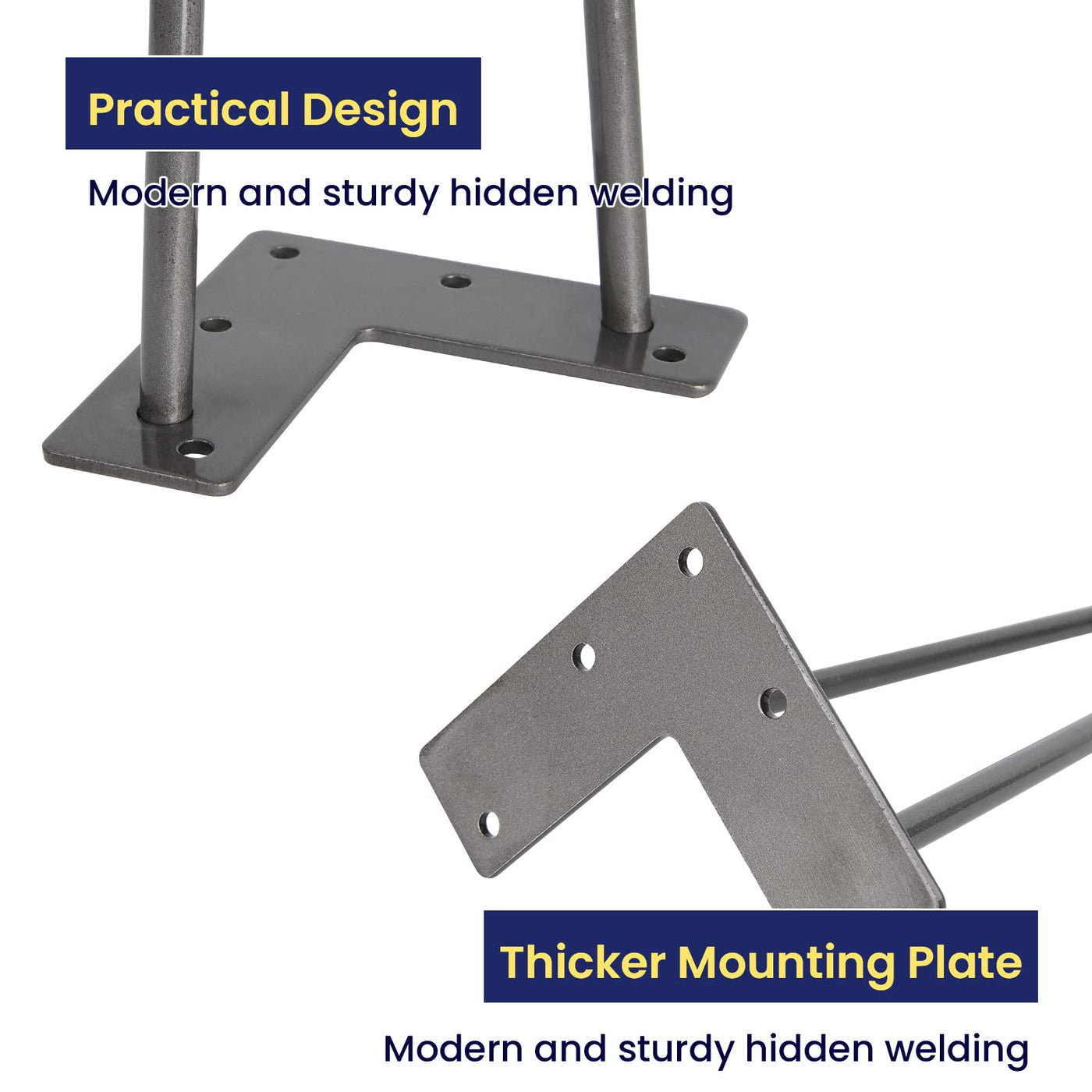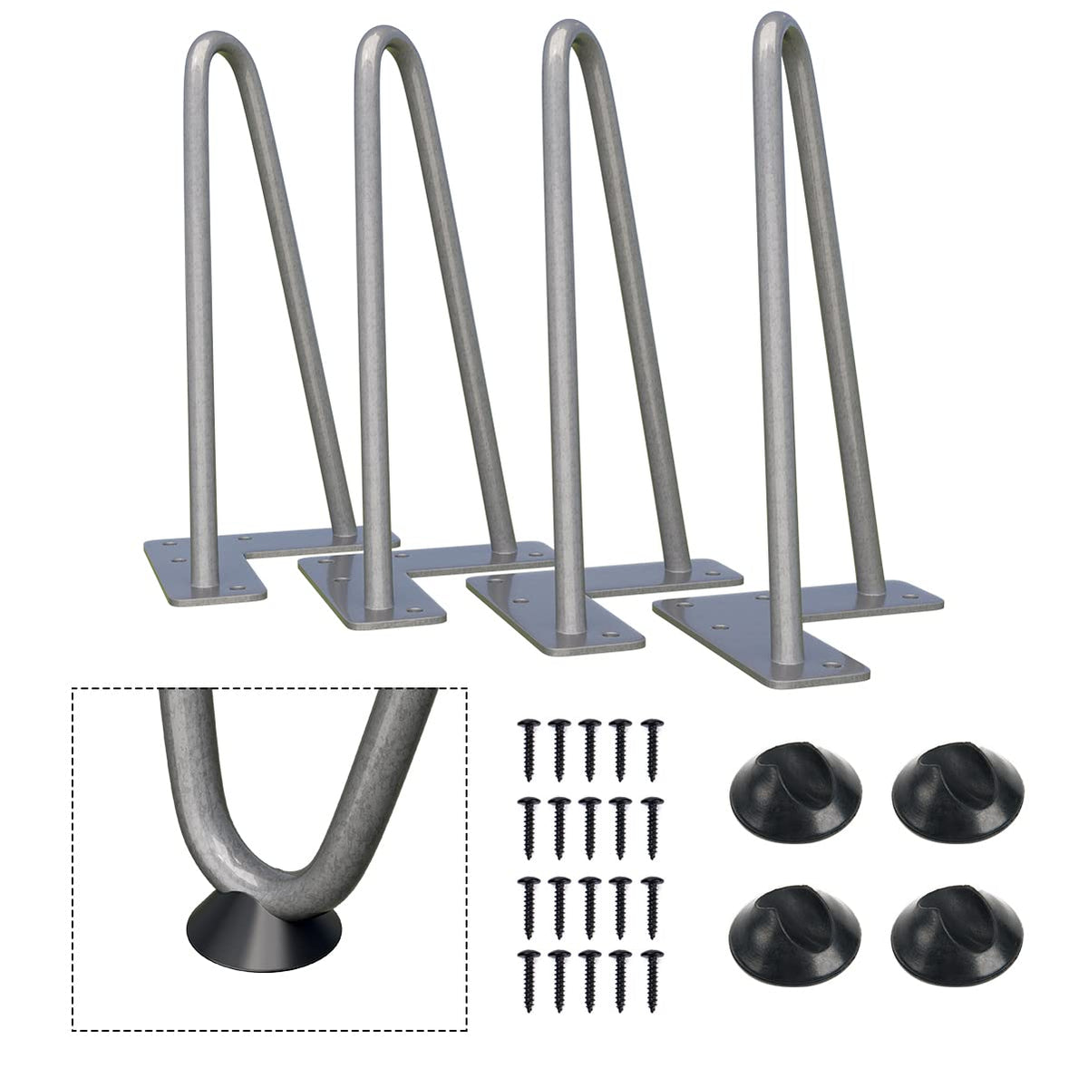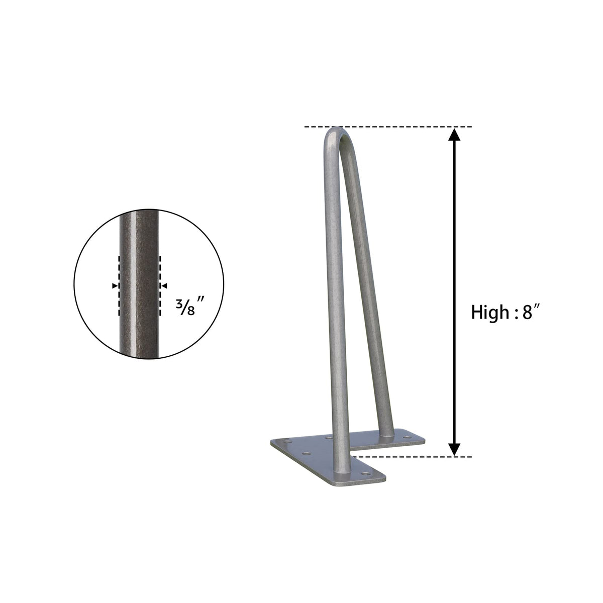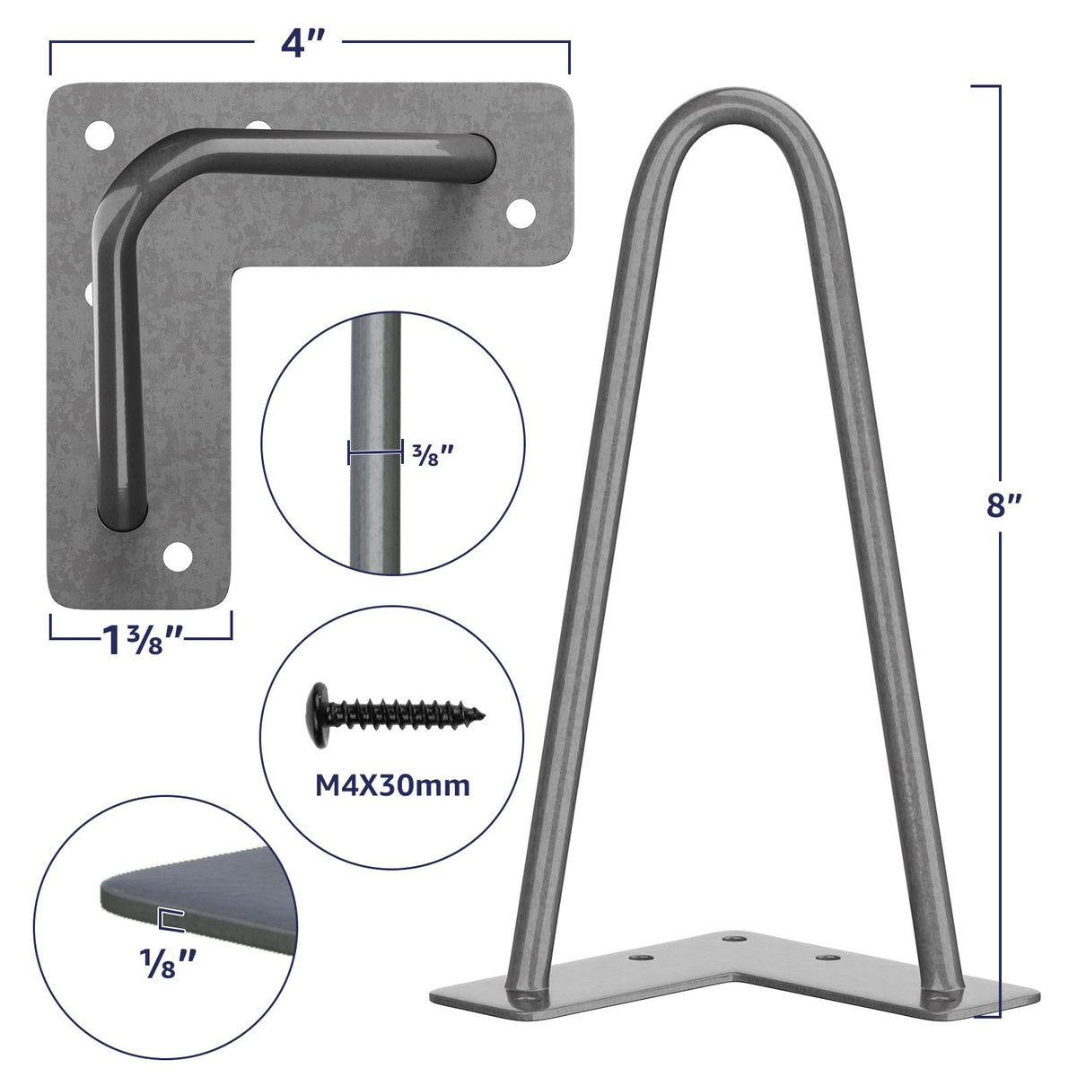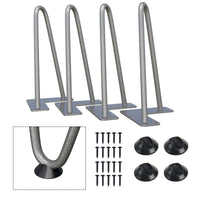 Additional Floor Protectors: When you purchase a set of mid-century modern legs you’ll also get a set of rubber feet! Use them to protect your floors from damage or as an added stabilizer for that wobbly chair or table. You can use them to make dining table legs, farmhouse table legs, outdoor table legs, metal table legs! | DIY Project: Mount these 8-inch legs (set of 4) with the tabletop of your choice To create a kind of industrial modern piece. You can create something by adding a new level of decor to your space, with the flexibility to make the piece your own style. | Mounting Bracket Pre-drilled for Easy Installation: The mounting bracket is pre-drilled with 5 holes for quick assembly. The mounting plate measures 4 inches long x 1 7/8 inch wide x 1/8 inch thick. | Made of Heavy Duty Solid Steel: These Hairpin legs are made of 3/8'' cold Rolled sturdy steel. The heavy-duty legs come with a Gray powder-coated finish and will support up to 300 lbs. | Designed for Versatility: With a sleek, mid-century modern look, our industrial table legs are suited for desks, benches, and any piece of furniture in between! Finished with powder coating technology, the legs are glossy and smooth to the touch.