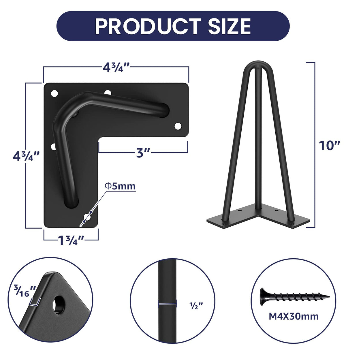 Heavy Duty Steel: These hairpin legs are made of 1/2 inch pipe diameter cold rolled sturdy steel. The heavy-duty table legs come with the black powder-coated finish. Four legs will support up to 900lbs. | Thick Mount Plate: The mounting plate size is 4 3/4 inch in length,13/4 inch in width, and 3/16 inch in thickness. The mounting plate is pre-drilled with 5 holes for easy assembly. | Easy Installation: First, drilling five 3mm diameter holes in the countertop. M4x30mm screws are provided. So the countertop thickness is thicker than 1 3/16'. If you want to attach to the thinner panel, it is suggested to buy some shorter screws. | Floor Protectors:Each set are equipped with 4 floor protecting feet. They are not only keep your wood floors, tiles, marble from scratching, marking, or otherwise damaged, but offer stable for your table. It will no noise during moving the table. | Versatile Scenes: These legs can be used as the DIY project. They are suit for wood countertop, laminate countertop and butcher block countertop. Perfect choice for coffee table, side/end table, dining table, console table, TV stand and nightstand.