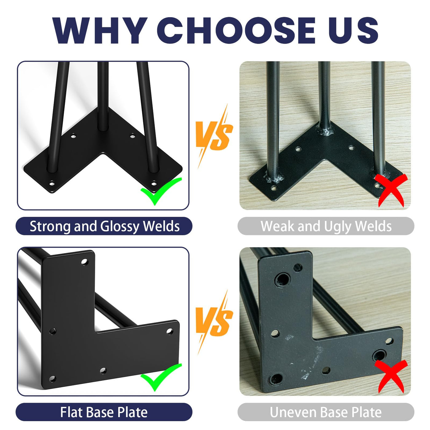 Q: Can these legs be used on different types of countertops?A: Absolutely! These hairpin legs are versatile and can be used with wood, laminate, and butcher block countertops, making them a perfect choice for coffee tables, side tables, and more.