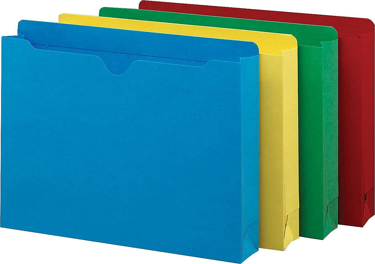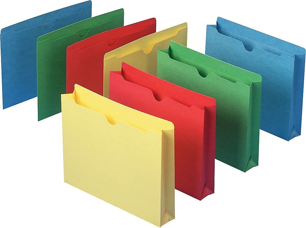 Closed Sides Keep Papers Secure; Vibrant Colors Help To Organize. Thumb Cut For Quick Access. Back Tab Is 1/2'' Higher Than Front For Indexing. This Product Was Made Using Wood Sourced From A Certified Managed Forest. Sleeve Jacket Type: File Jacket-Top Tab; Material(S): 11 Pt. Stock; Height: 9 1/2''; Width: 11 3/4''.