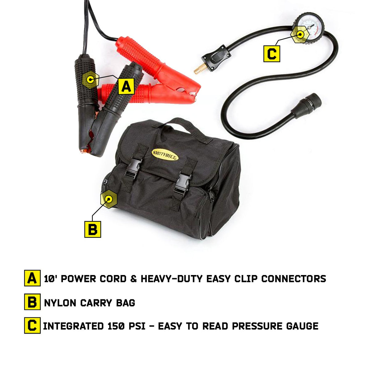 Q: Is the SmittyBilt AIR COMPRESSOR portable?A: Yes, the SmittyBilt AIR COMPRESSOR is lightweight at 5.5 pounds and comes with a 10-foot power cord and a nylon storage bag, making it easy to transport and store.