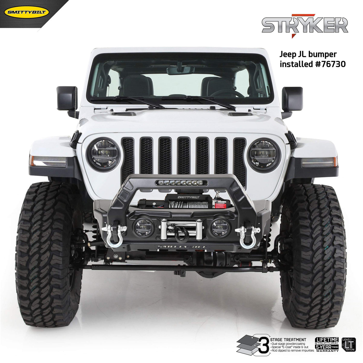 Smittybilts New Stryker Modular Bumper Is Perfect For Rock Crawling Or Everyday Driving, Blending Strength With Modern, Aerodynamic Styling And Providing Multiple Options For Supplemental Lighting. Deep Draw Press-Formed From 3Mm Cold Rolled Steel, The Base Center Sections Aggressive, Stubby Design Allows For Extreme Off-Roading While Offering Significant Weight Savings Over Standard Steel. A Bolt-On Internal Winch Plate (When Fitted With A Winch Up To 12K), Integrated Lift Points And 7/8 D-Ring Mounts Makes Recovery A Breeze. The Heavy Duty Reinforced Skid Plate With Added Lower Mounting Support To Protect Your Front End From Rock Damage. The Stylish Overrider Is Removeable And When Bolted On Can Accommodate A Single Row Led Light Bar. The Optional Smittybilt Stryker Side Wings Offer Front Side Protection While Supplying Provisions For Additional Lighting. The Stryker Modular Bumper Is Compatible With Both The Jeep Jk And Jl And Is Backed By The Smittybilt Advantage - One Of The Strongest Warranties Available In The Industry. This Features Limited Lifetime Coverage For All Steel-Based Products From Manufacturer Defects, Which Ensures Customers Can Enjoy The Freedom Of Off-Roading Without Worry Or Limitations.