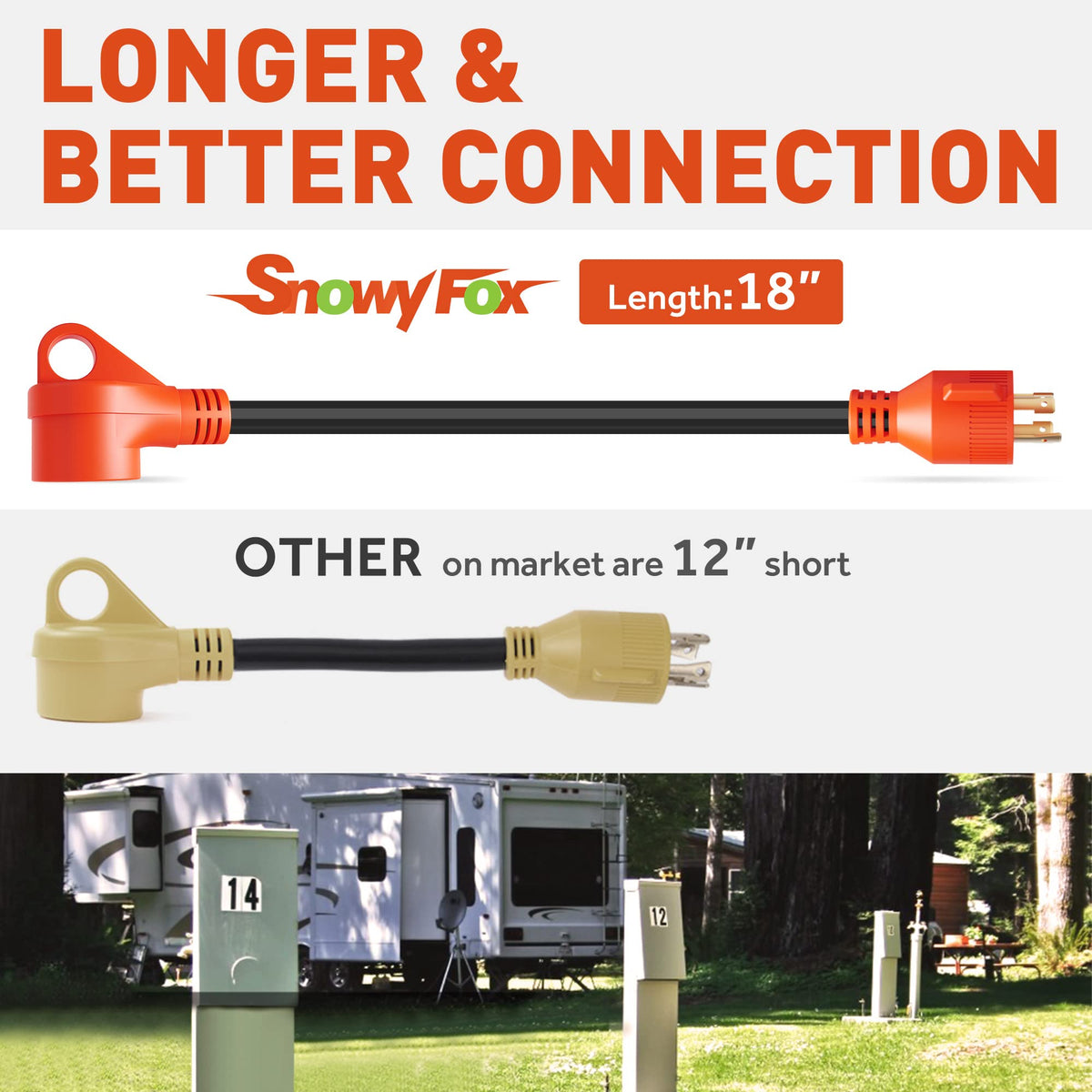 Q: How long is the SnowyFox RV Generator Adapter Cord, and why is this important?A: The adapter cord is 18 inches long, which provides greater flexibility and ease of connection compared to many standard adapters that are only 12 inches long. This extra length makes it easier to reach between your generator and RV without straining the cord.