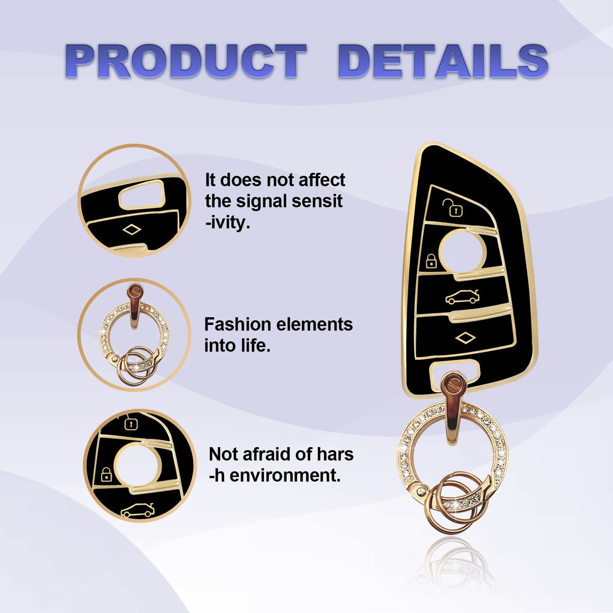 Premium Material1.Made of premium TPU material, The key case is super soft, Thin and wear-resistant.2.The surface adopts the electroplating technology and golden edge,making it shining,stylish and unique.3.360 Degree Protection, The key fob case tightly wraps the key in all directions,4.Protect