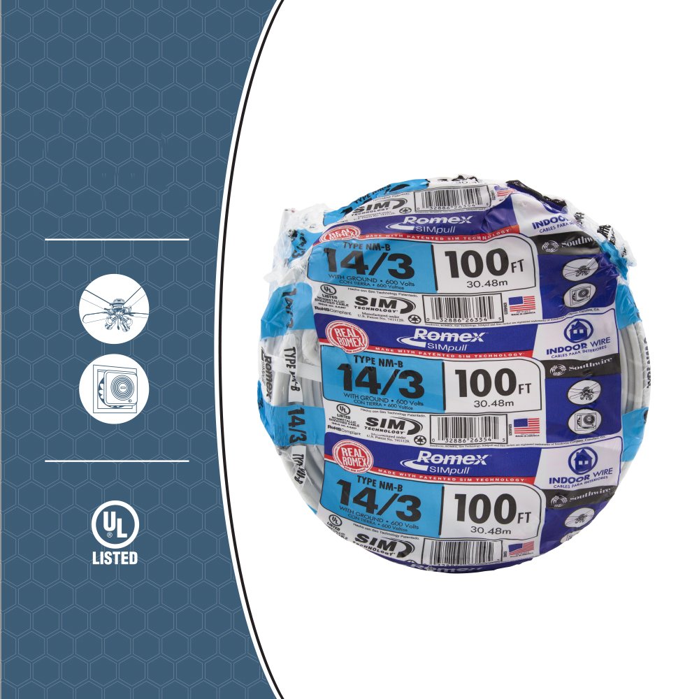 Q: What is Southwire Romex Brand Simpull Solid Indoor 14/3 W/G NMB Cable used for?A: The Southwire Romex Brand Simpull Solid Indoor 14/3 W/G NMB Cable is designed for general wiring applications in homes, stores, and shops. It is primarily used for branch circuits powering outlets, switches, and other loads in residential wiring.