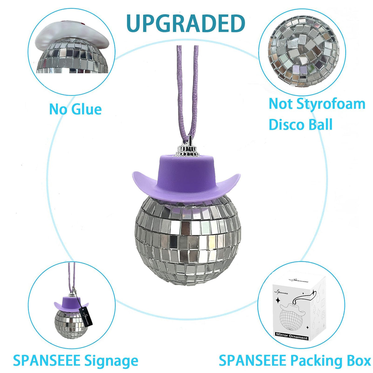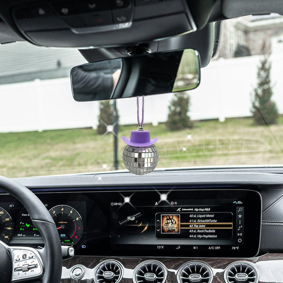 Spansee Purple Disco Ball With Cowboy Hat Car Charm, Rear View Mirror Accessory