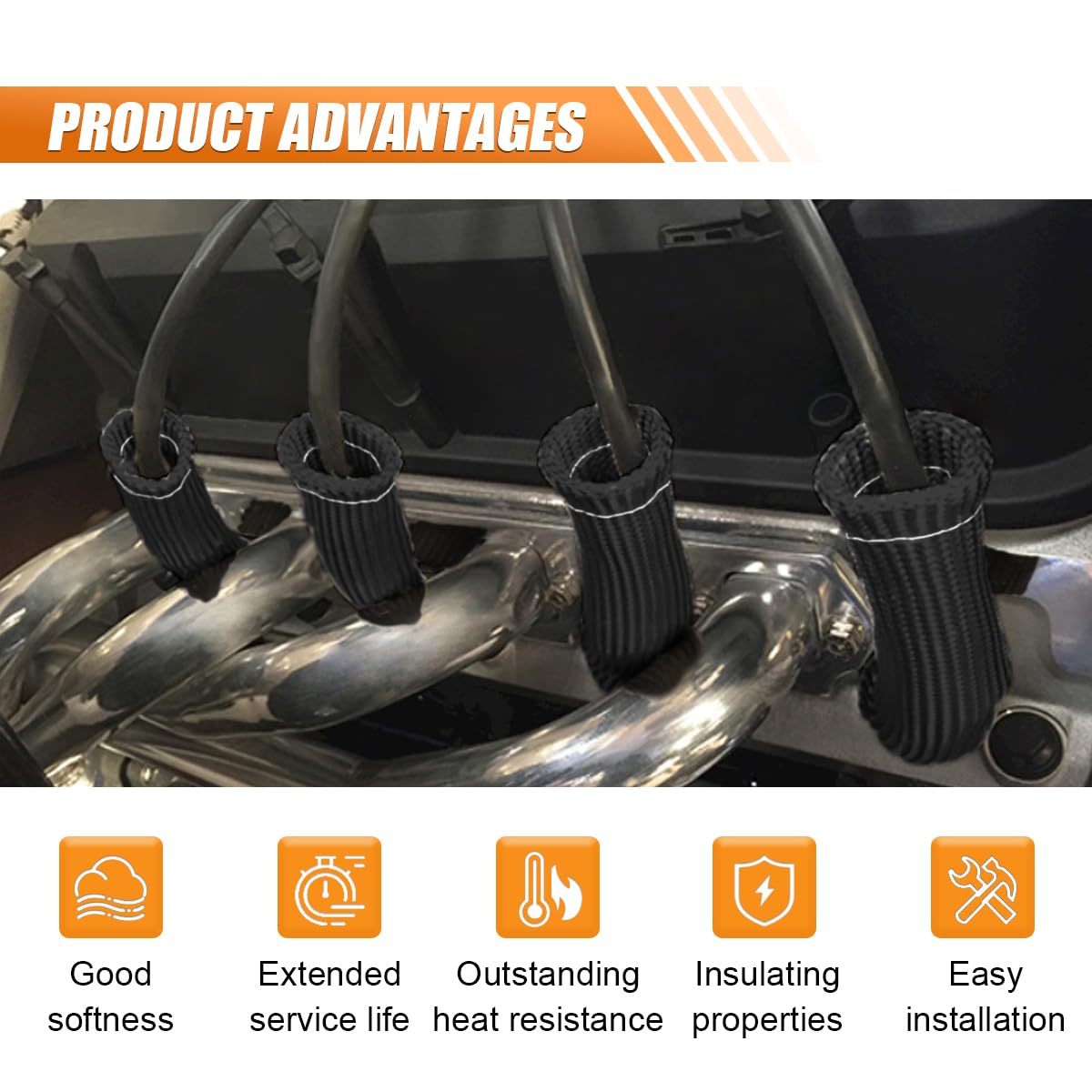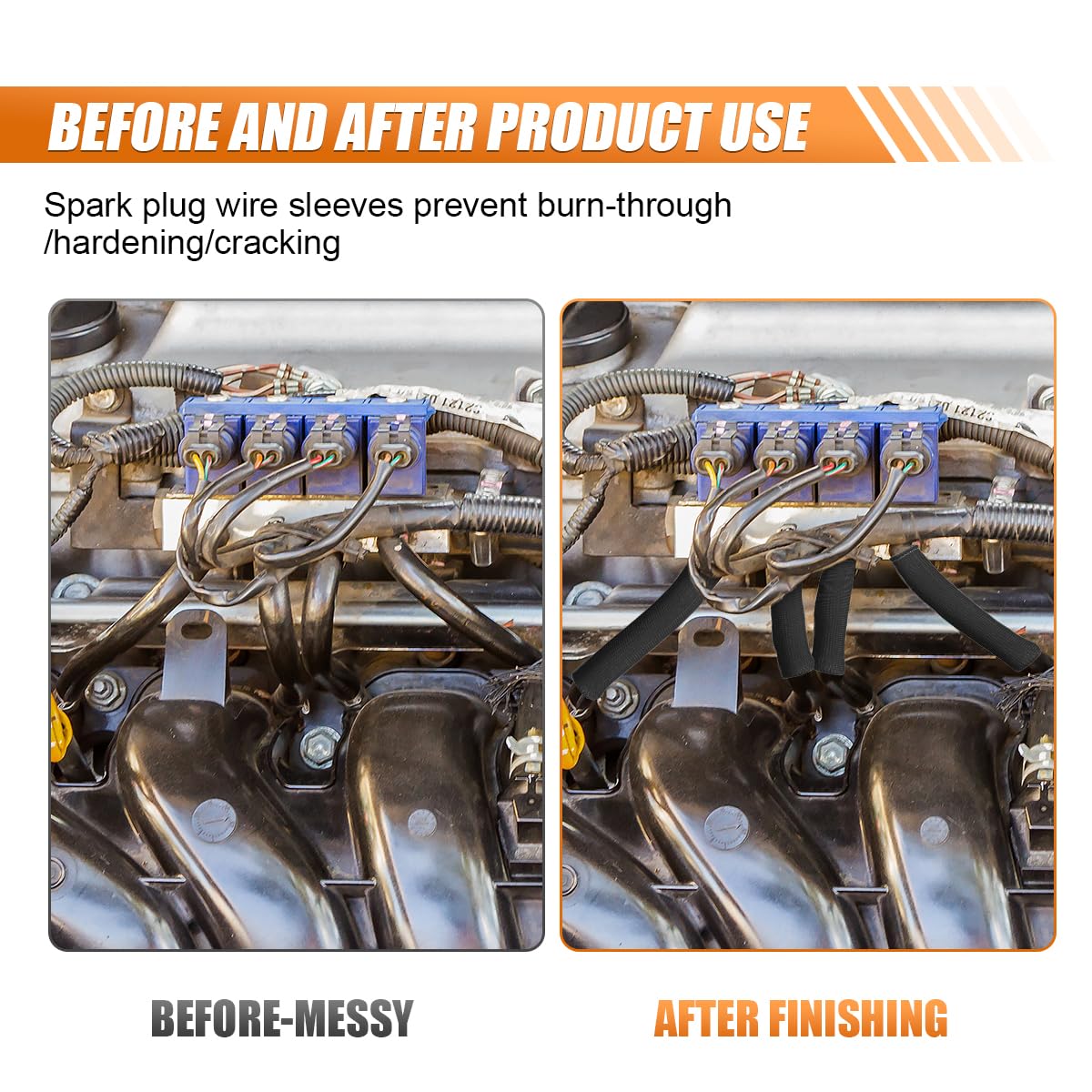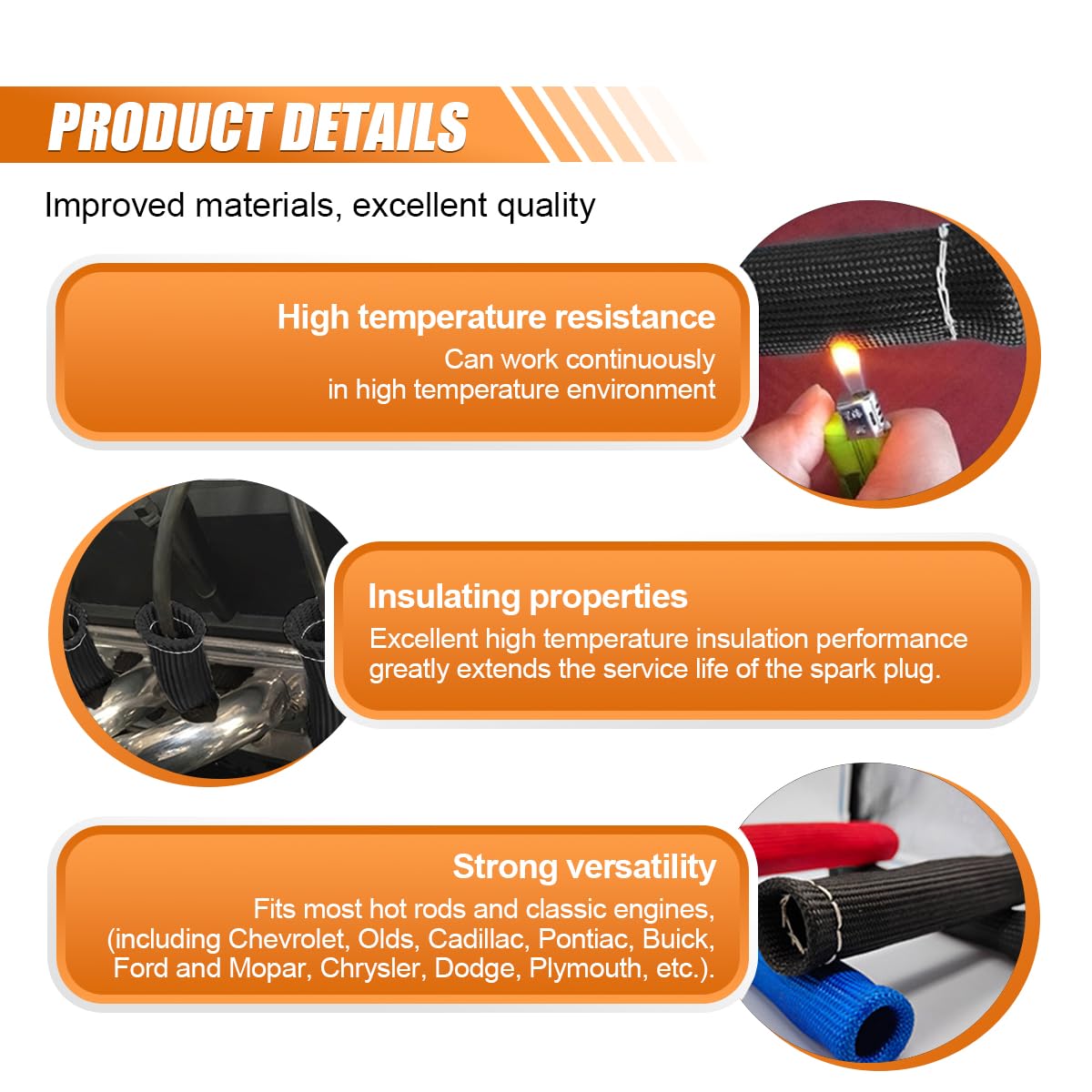 The spark plug wire sleeves are made of high-quality fiberglass, thick and long enough to shield spark plug wires near the headers or exhaust manifold, increasing wire lifespan and maintaining optimal spark for your vehicle.Specification:Brand: JOYCOURTName: Spark Plug Wire Boots ProtectorColor: Black/Red/BlueMaterial: FiberglassSize: 5.96*1.06inchApplicable: Most vehiclesFeatures: -The spark plug protector accessory provides essential heat protection for optimal engine performance, sustainablity, and safety.-The spark plug cover is long enough to shield spark plug wires, especially near the manifold or exhaust headers.-Double-wall braided fiberglass sleeves with triple-needle sewn ends offer excellent high temperature resistance and corrosion protection.