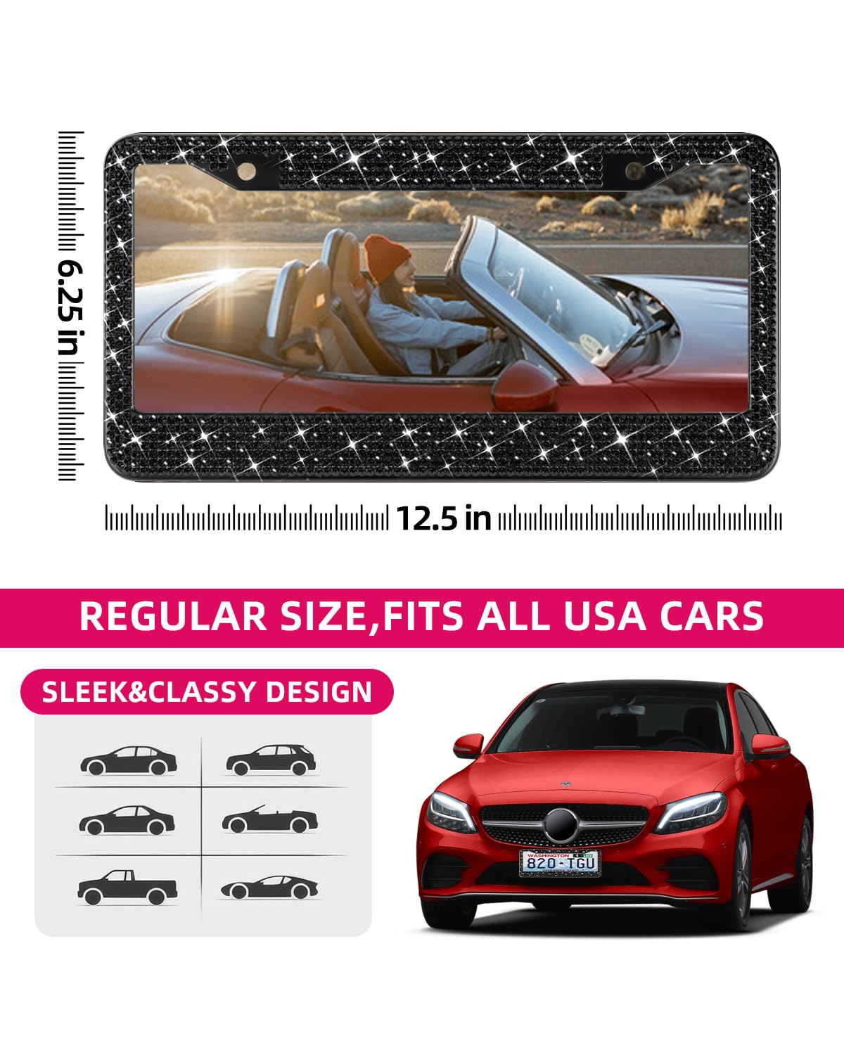 Sparkly Rhinestone License Plate Frame For Women - Stainless Steel With 1200 Black Glass Crystals