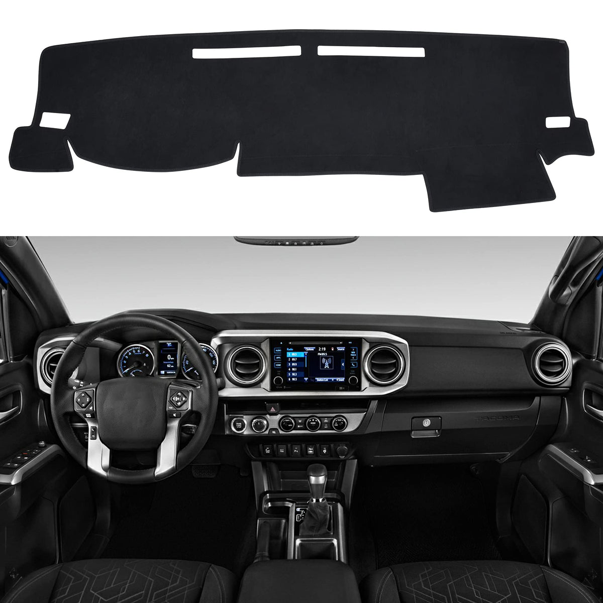 The Dash Board Cover Mat compatible with Toyota Tacoma 2016-2023 | This dash cover protects the dash surface from ultraviolet rays that can cause cracks and warping. It can cover blemishes and imperfections of old dashboards. The dash cover also helps reduce hazardous windshield glare, keep interiors cooler in the summer and warmer in the winter. | Dash covers are a great way to reduce windshield glare. The vehicles that experience windshield glare though should go towards darker colors like black or charcoal that will absorb light versus reflect light. | Face fabric is Solution Dyed Polyester with high UV inhibitors for consistent color and maximum color fastness over time in the sun. The Suede is a low knap for a flat, low glare finish and will have high-low shading effects typical of Suede material. | The vents and speakers-We know how important A/C is your truck. We won't block any of the vents and will have cutouts for them. With speakers any flat speakers we cover but also don't worry the material is specially designed not to obstruct sound.If you have any questions during use, please contact us at the first time, we will give you a satisfactory answer.