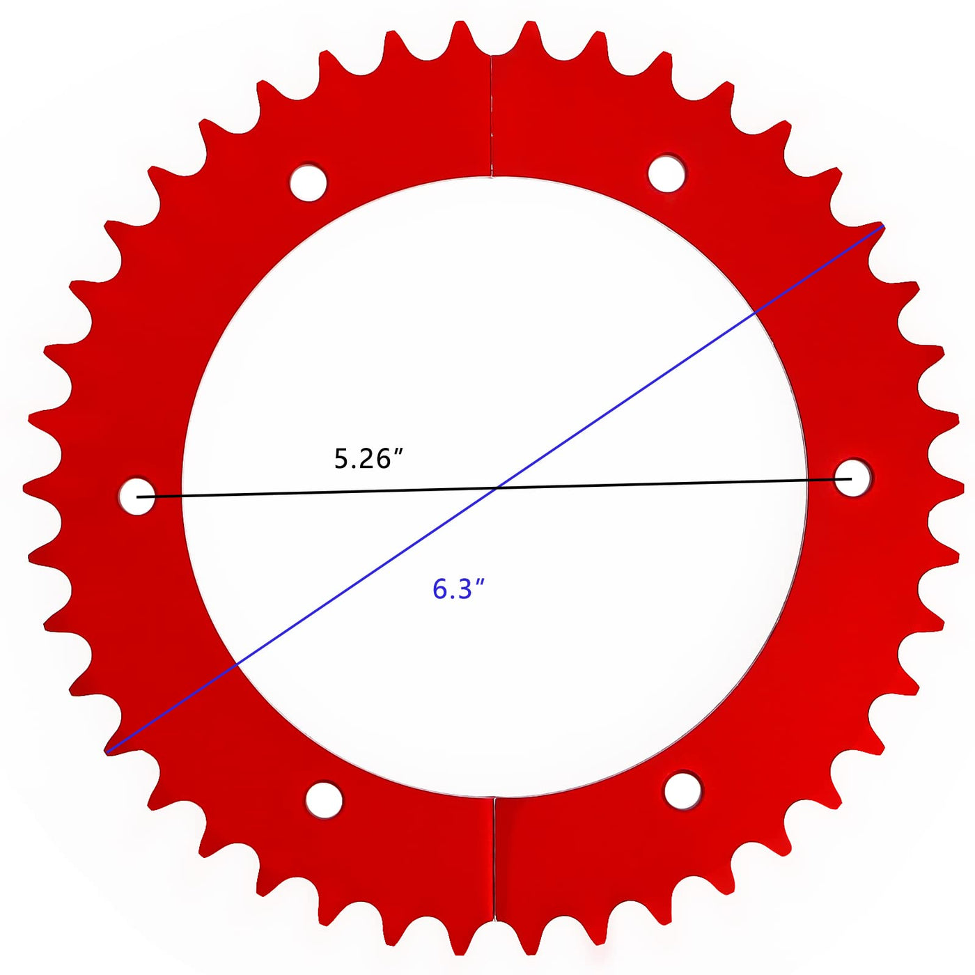 Q: What are the dimensions of the Split Sprocket?A: The Split Sprocket features a 42-tooth configuration with a #40 pitch chain, an outside diameter of 6.89 inches, an inside diameter of 4.53 inches, a bolt pattern of 5.25 inches, and a 1/4 inch mounting hole.