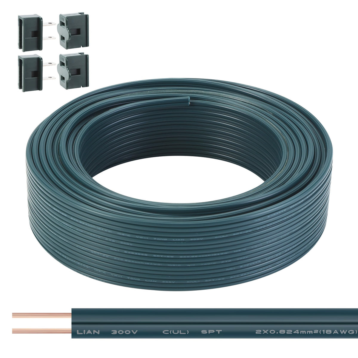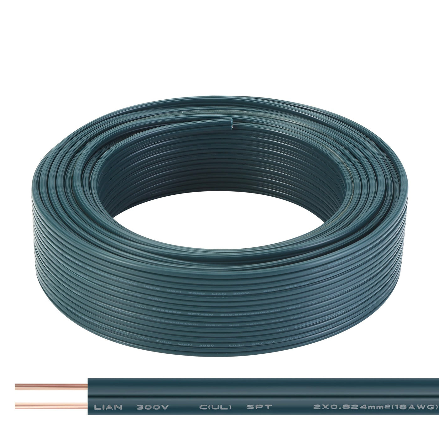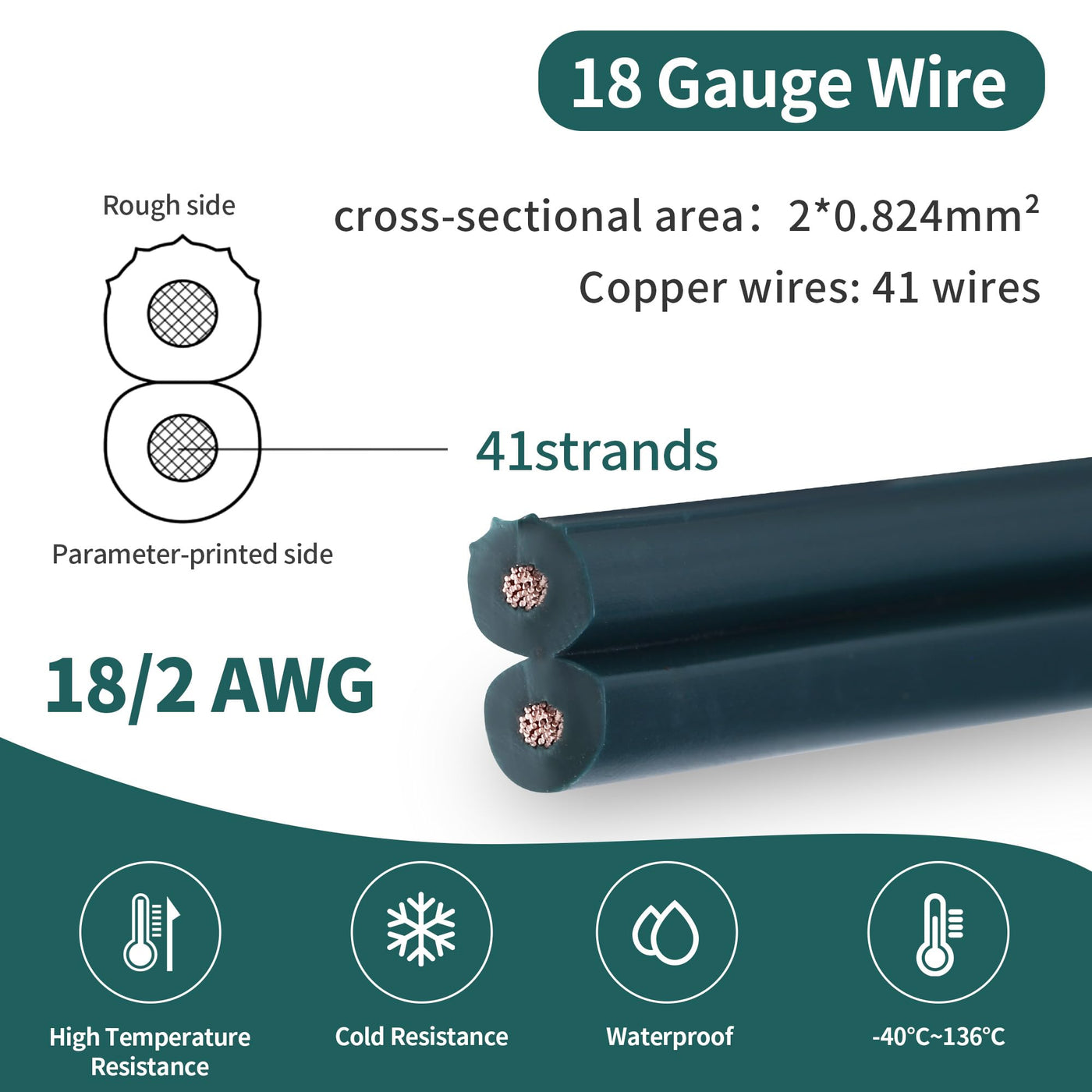 Specification: 18 Guage 2pin wire. Maximum working voltage: 300V. Low voltage applicable, great for uses with 120V or less. Temperature Range: -40°F to +276.8°F|High Quality & Safety: Made of copper strands with PVC VW-1 material coating, 41 tiny lines twined together, insulation thickness: 1.4mm, overall diameter: 3.4*6.8mm. The wire is flame retardant, anti-aging, acid and alkali resistant, and moisture resistant|Convenient: This hook up wire can be directly used, also can be stripped and connected to the equipment needed|Easy to Use: The 18/2 electric wire is lightweight, thin, soft can be bent arbitrarily, and is easy to strip, weld, crimp terminals, connect, cut, and wrap around necessary components enough to fit into tight spaces|Wide Application: Suitable for indoor household appliances & low voltage outdoor uses. Such as garden lights, accent lights, path lights, spotlights, garden accessories, outdoor speaker, solar panel and so on|Note: Insulation thickness differs from SPT-1 wire (0.76mm) and SPT-2 wire (1.4mm).
