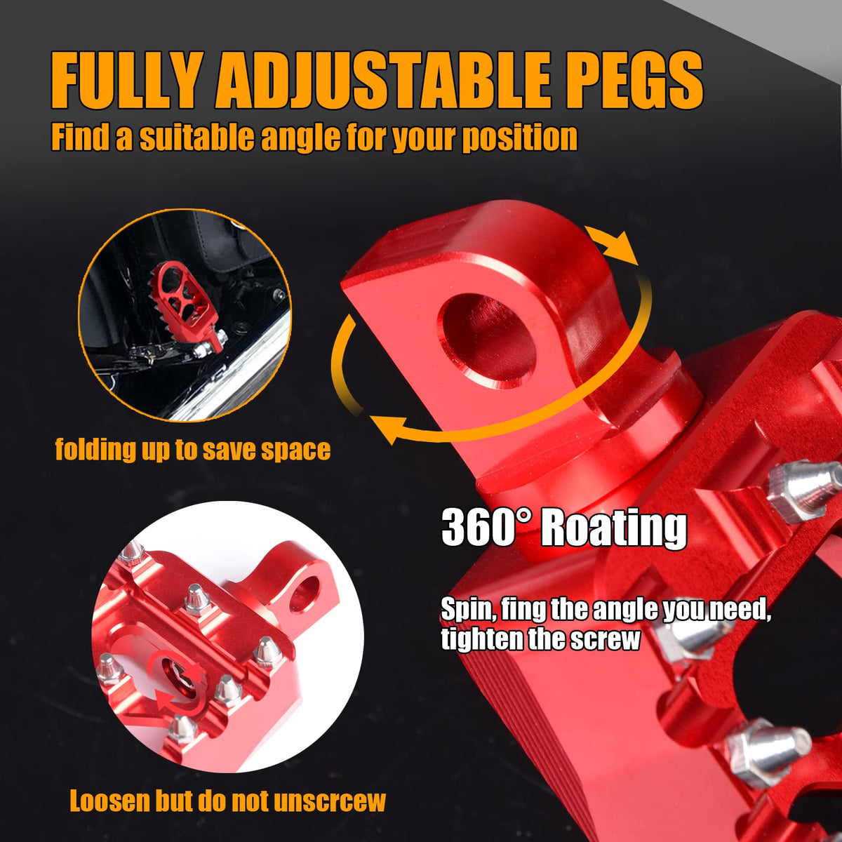 Q: How does the 360-degree rotation feature work?A: The 360-degree rotation feature allows the foot pegs to be adjusted to any angle that suits your comfort. The pegs are equipped with two ball bearings and a drilled detent mechanism, enabling you to lock them in place once you've found your preferred angle.