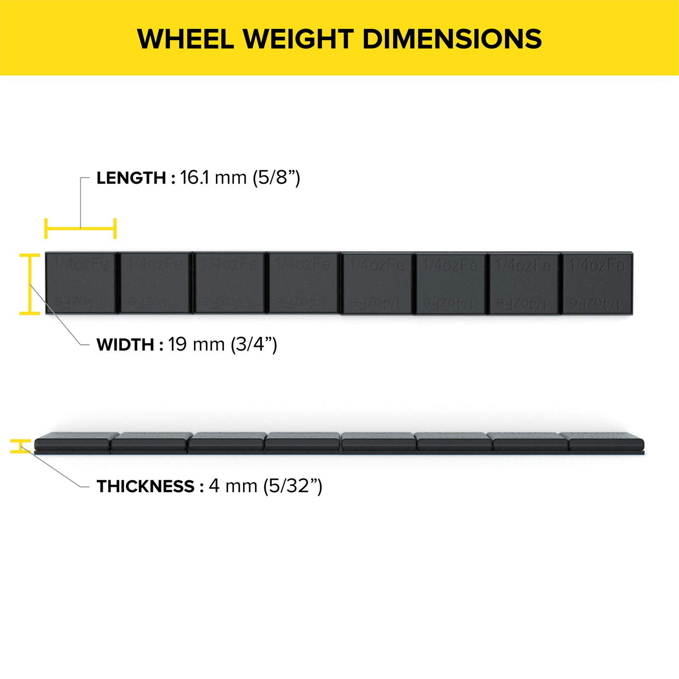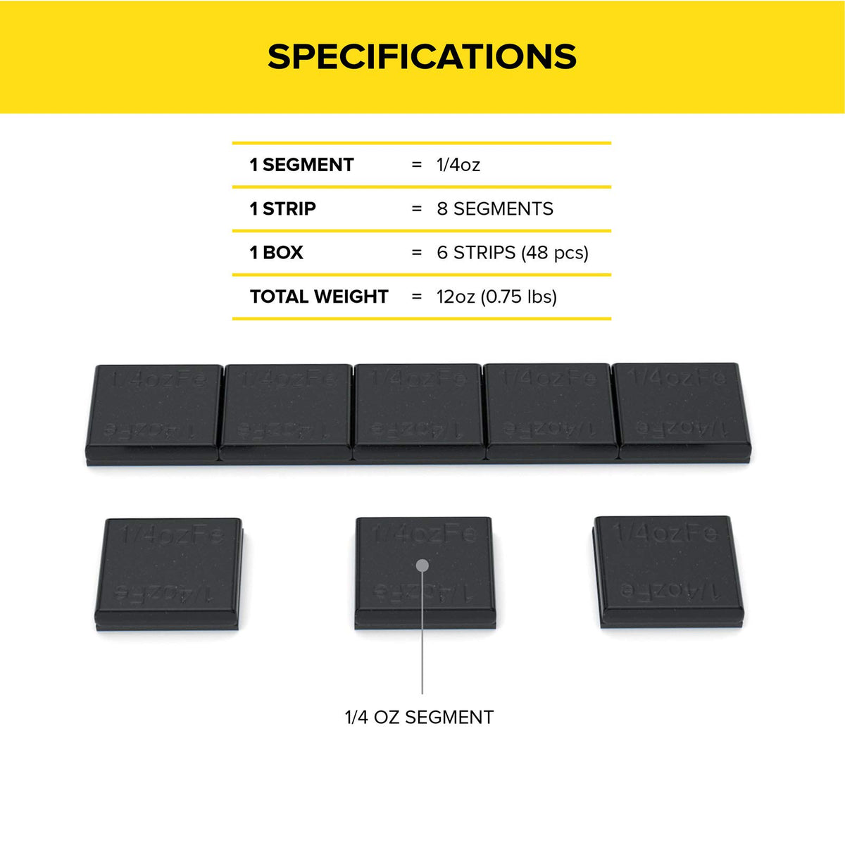 1 box of zinc plated wheel weights. The adhesive will securely hold the weight on any wheel. Be aware that the area on the wheel must be cleaned prior to attaching the weight. [ DETAILS per box ] - 1/4oz Segments - 8 Segments per Strip - 6 Strips per Box Total Weight Per Box: 12 oz (0.75 lbs)*** NOTE: Our Weights are Lead-free. The E.P.A. recently banned the use of lead tire weights in certain U.S. states. So if you happen to live in one of the states that banned lead wheel weights, these are the weights are for you. Tire businesses that are caught illegally installing them on vehicles could be fined up to $500. [ OTHER OPTIONS ] We carry wheel weights in 1/2oz and 1/4oz, in silver and black, in a variety of quantities. To view our selection, please copy and paste the following link into your browser: https://www.amazon.com/s/ref=nb_sb_noss?url=search-alias%3Daps&field-keywords=StanceMagic+'Wheel+Weights'