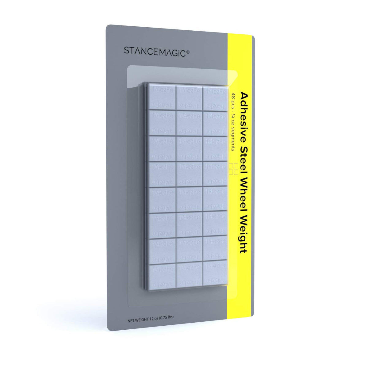 Q: What is the total weight and configuration of each box?A: Each box of StanceMagic wheel weights contains a total weight of 12 oz (0.75 lbs) and includes 48 pieces. The weights are segmented into 1/4oz segments, with 8 segments per strip and 6 strips per box.