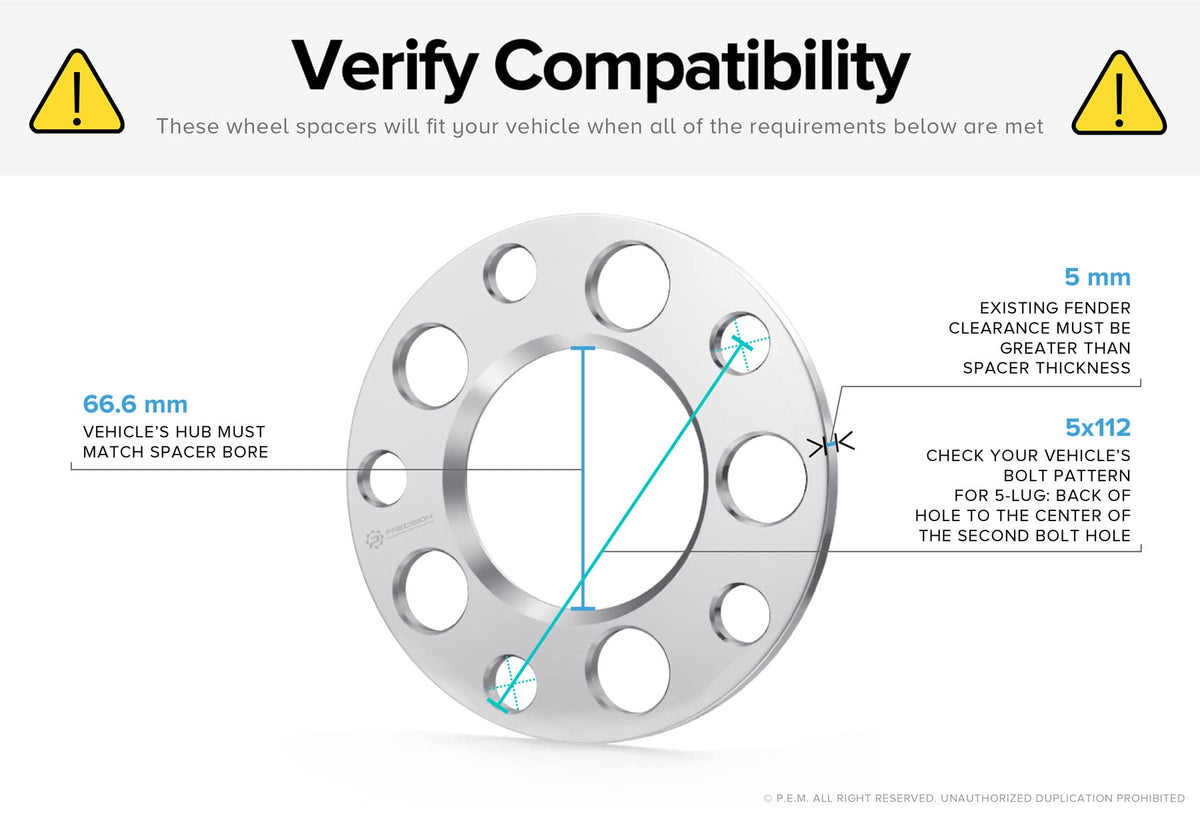 • Q: How do I ensure the correct fitment before purchasing? A: Before purchasing, it's crucial to verify that your vehicle has at least 5mm of space between the fender and the wheel/tire. Additionally, ensure that your studs or bolts are compatible and the correct length. Always check the specifications provided in the product description to confirm fitment.