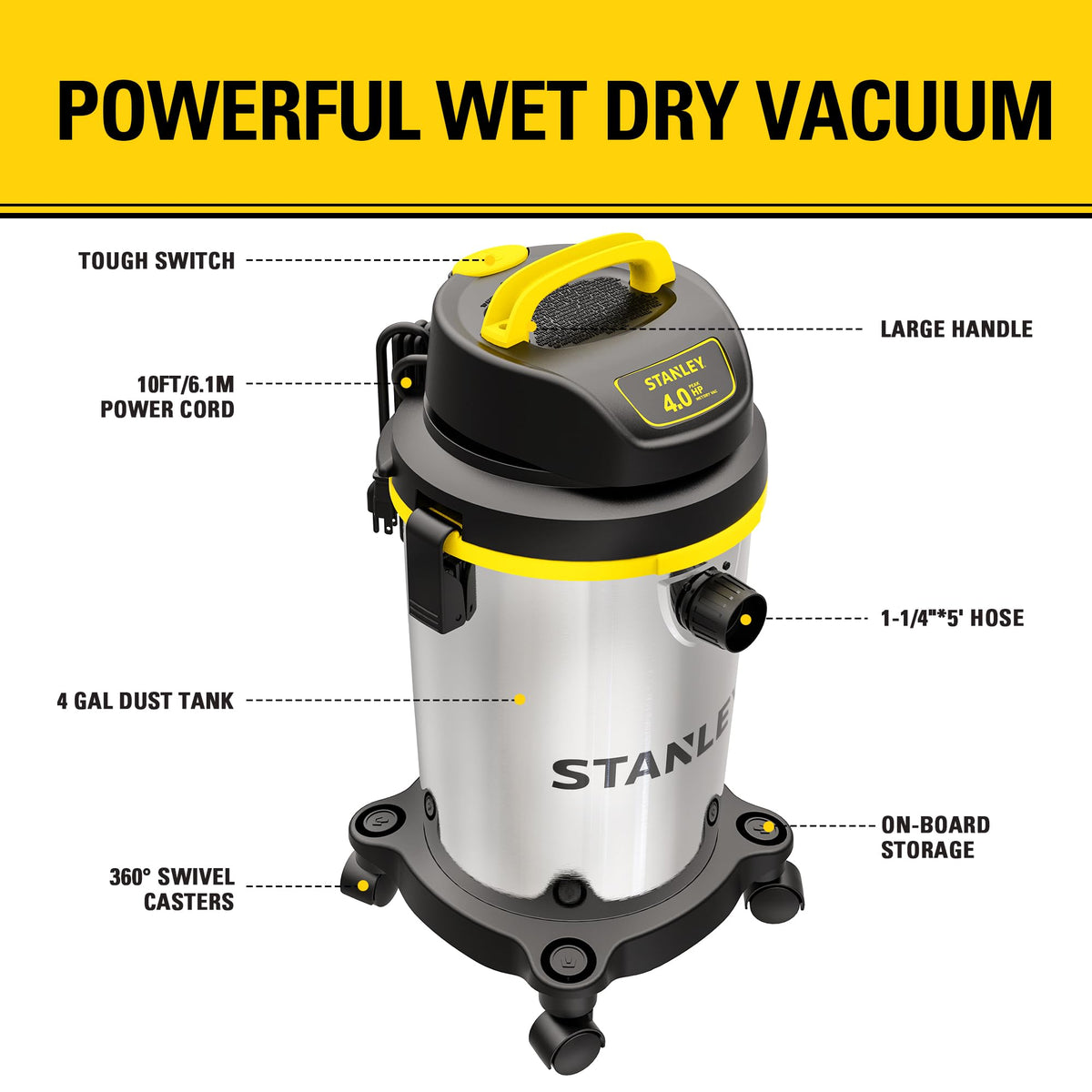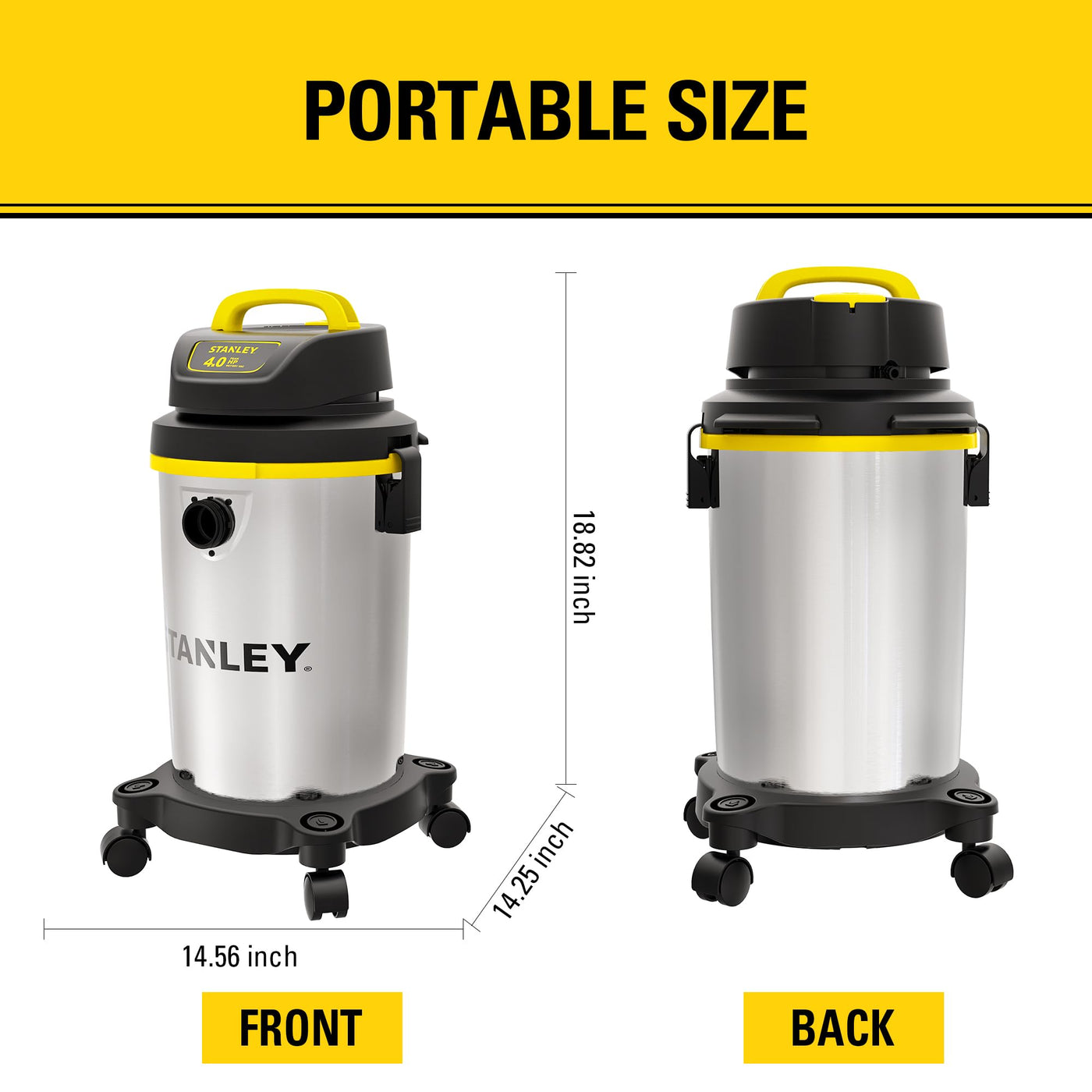 ?STANLEY BRAND?STANLEY is a well-known brand that focuses on R & D, production and sales of vacuum cleaners. In addition, STANLEY is the recognized world leader in wet/dry vacuum cleaners. Since 1843, we have produced innovative, high quality vacuum cleaners, hose, filters, bags, and other accessories | ?Powerful Functions?This 4 gallons wet/dry vacuum can satisfy normal daily using for you, you can use it for a long time without frequent cleaning of the trash inside. You just need to close the cover, connect the hose, and plug in the power. The 4.0 horsepower makes it easy to suck all kinds of debris, garbage, dirty water into tank. Lightweight 8 pounds with 4 wheels for portable moving | ?Applications Target?Benefit from its powerful vacuuming function, the STANLEY SL18129 shop vacuum wet and dry is very useful for household, upholster, garage, workshop, hotel, car wash, laundry, shop, office, bedroom, kitchen, sofa, pet hair, etc | ?Useful Features?Over 18’ of cleaning reach (Hose 5’ , Power Cord 10’, Wand 3’) allows you to reach farther without unplugging. It can work over 300 H continuously for you. Large switch makes it convenient for control. Big handle make you carry it easily | ?Package Included?You will get the parts as below: Stanley SL18129 Wet / Dry Vac x 1, Diameter 1-1/4' x Length 5' super flexible hose x 1, Extension wands x 3, Floor nozzle x 1, Crevice nozzle x 1, Foam filter x 1, Dust bag x 1, Reusable dry filter x 1, 12-month warranty