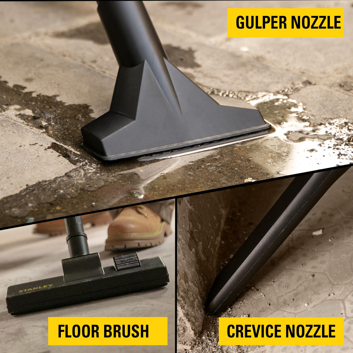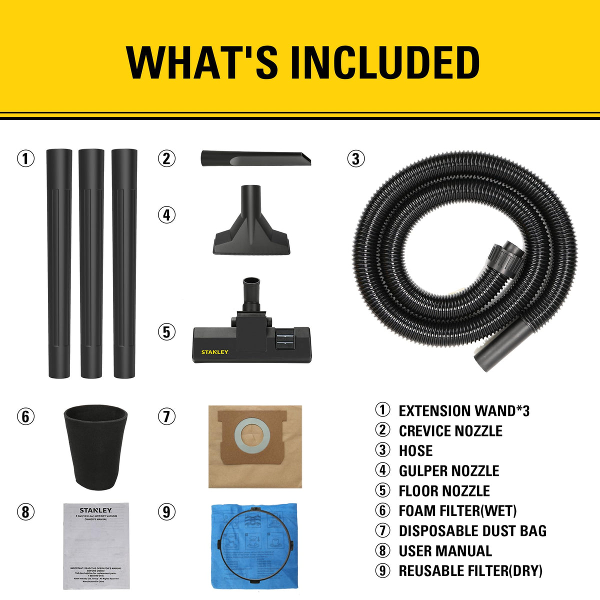 Q: What accessories are included with the Stanley SL18129 vacuum?A: The package includes the Stanley SL18129 Wet/Dry Vac, three extension wands, a floor nozzle, a crevice nozzle, a foam filter, a dust bag, and a reusable dry filter, ensuring you have everything needed for efficient cleaning.