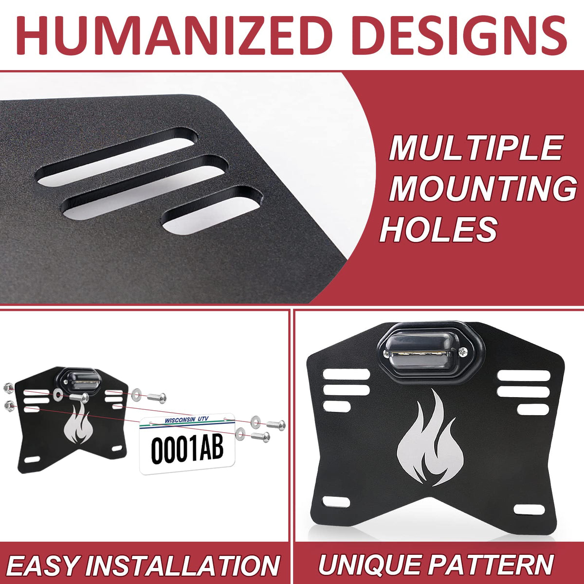 Q: How do I install the Starknightmt UTV License Plate Holder?A: Installation is straightforward with the provided 4 machine screws, washers, and fasteners. The holder features fixing holes of 4 sizes for adaptability and stability, allowing for easy installation on various vehicles.