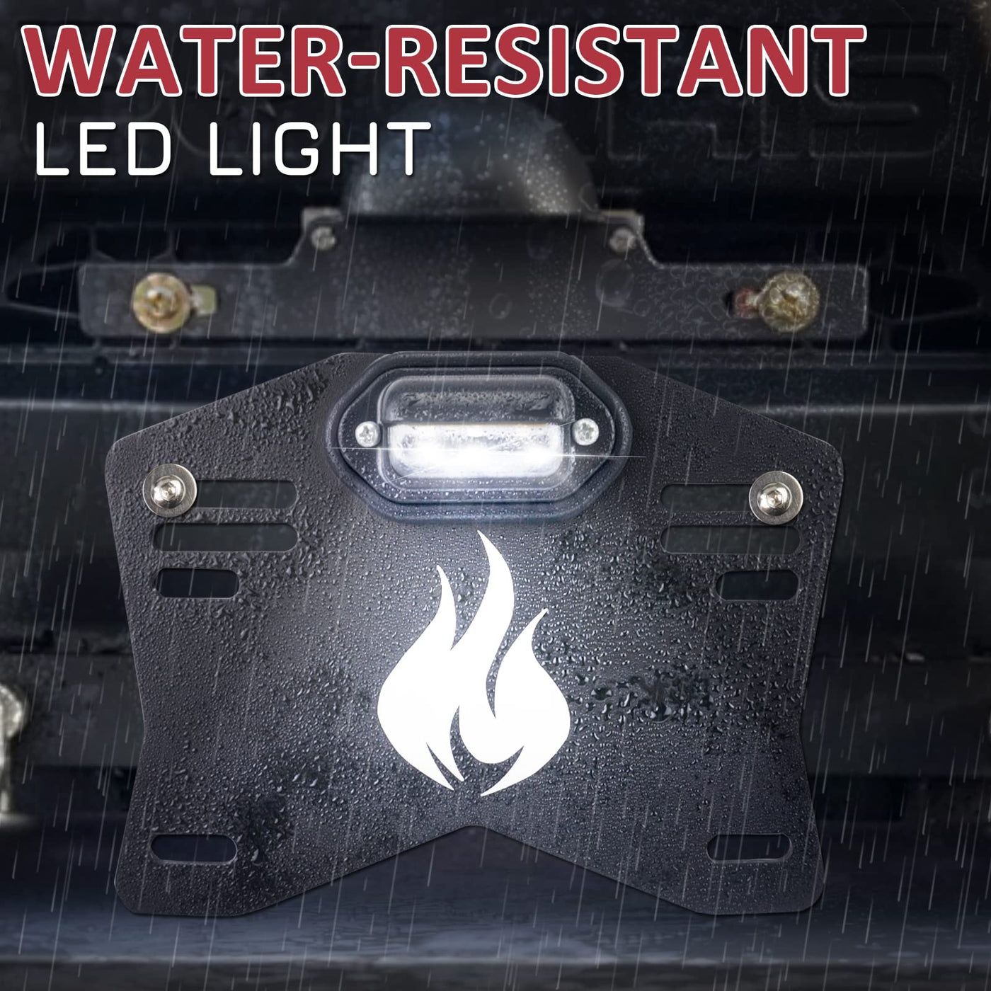 Q: Is the license plate holder waterproof?A: Yes, the Starknightmt UTV License Plate Holder features IP67 waterproof LED lights, making it durable and reliable even in wet conditions, such as driving through puddles or during rain.