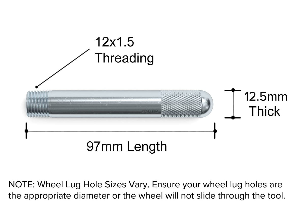 Q: What are the specifications of this wheel hanger alignment tool?A: This tool features a metric M12x1.5 thread size, a total length of 97mm (3.80 inches), and a diameter of 12.5mm. It is made from strong cold forged grade 10.9 carbon steel and includes a special zinc coating for corrosion and rust resistance.