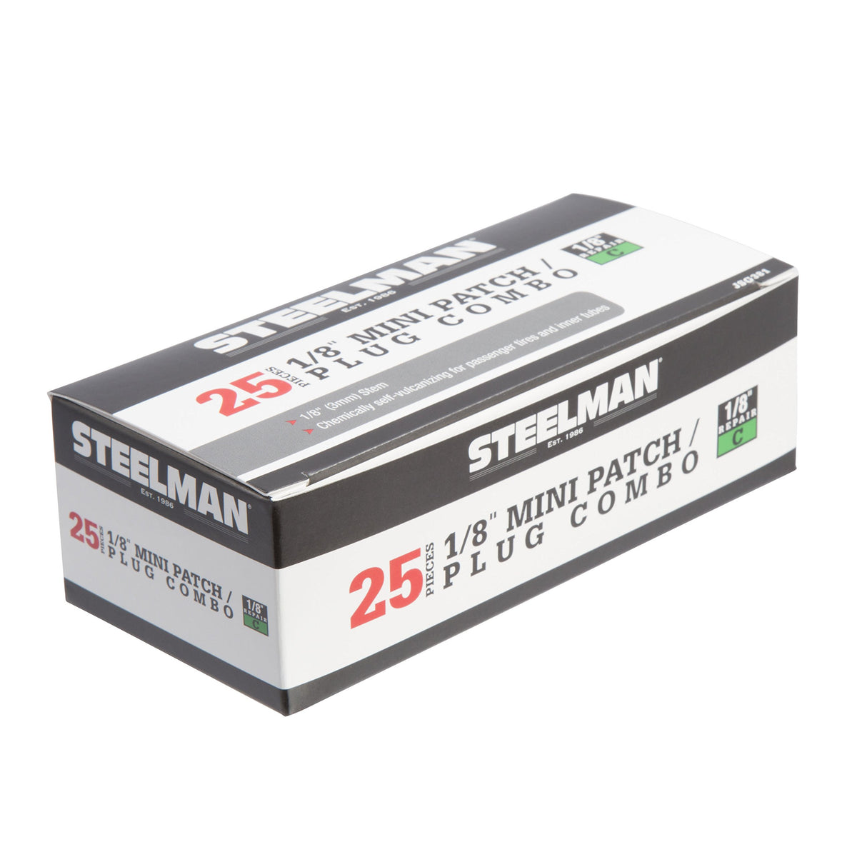 When performing Rubber Manufacturer's Association (RMA) approved tire repair procedures for pneumatic tires, having the right patches and plugs is essential. STEELMAN combination patch and plugs are a one piece repair for tire injuries up to 1/8-inch (3mm) that do not exceed 25 degrees off perpendicular. This patch/plug combo will vulcanize either chemically via vulcanizing cement or in a heat cure system to create a permanent repair. The integrated lead wire makes it easy to fully seat the patch stem into the puncture channel and create a tight seal after which it can be trimmed off flush with the tire tread. Perfect to repairing radial and bias ply tubeless tires on automobiles, trucks, ATVs, and motorcycles. Comes in a box of 25 combination patch/stem plugs.STEELMAN is an industry leader in automotive and industrial specialty tools and equipment, manufacturing the highest quality, unique, and innovative tools and products, designed to meet the specific needs of mechanics, contractors, and other working professionals.
