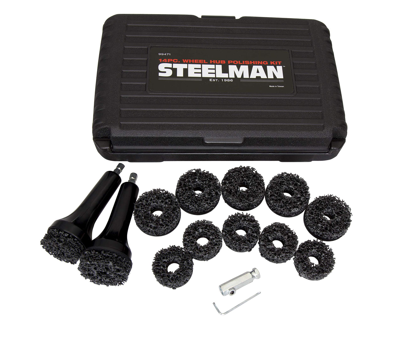When rust is allowed to build up on hubs, rotors, and brake drums it can cause wobbling due to improper alignment which results in rotor runout and rusted lug nuts can lead to improperly secured tires that check as torqued but are still loose on the wheel. Save yourself money and prevent costly repairs and replacements with the STEELMAN 99471 Hub and Rotor Polishing Kit. This handy kit includes both a smaller 1.5-inch and a larger 2-inch diameter adapter and corresponding cleaning pads to service virtually all passenger cars, light trucks, and SUVs. The durable nylon web resurfacing pads scour away rust and built-up road grime without damaging rotors, hub assemblies, and brake components like a wire brush or wheel and without the hazards of chemical cleaners. With their built-in 1/4-inch hex drives the adapters easily fit drills with either 3/8 or 1/2-inch chucks. The kit also includes a 3/8-inch adapter to fit the 3/8-inch drive chucks on most low speed tire buffers and a 1/2-inch drive adapter to fit onto 1/2-inch drive impact wrenches. Kit comes with a convenient blow-molded plastic case for easy storage and component organization.STEELMAN is an industry leader in automotive and industrial specialty tools and equipment, manufacturing the highest quality, unique, and innovative tools and products, designed to meet the specific needs of mechanics, contractors, and other working professionals.