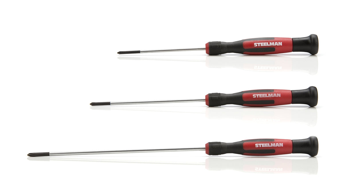 The Steelman Precision Steel Shaft 6-Piece Long Electronics Screwdriver Set is ideal for accessing cramped areas you might encounter during electronics repair. To prevent fasteners from falling off the screwdriver and being lost in the hard-to-reach spots of your electronic devices, each screwdriver features a black oxide-coated magnetic tip. The molded polypropylene handle of each tool features a rotating, swivel-head that allows you to apply even pressure and facilitates easy one-handed use. The molded handle with TPR rubber grip provides comfort and ultimate control. This set includes three flat/slotted drivers sized 2.0mm x 3-inch, 3.0mm x 4-inch, and 4.0mm x 6-inch and three Phillips drivers sized PH00 x 3-inch, PH0 x 4-inch, and PH1 x 6-inch. Ideal repairing computers, RC vehicles, and other electronics, these screwdrivers will quickly become a staple in your tool collection. STEELMAN’s screwdriver selection includes every tip design in multiple sizes so you can find the tool you need to accomplish your task, no matter the scale. Choose between magnetized or non-magnetic tips, short or long handles, and from a wide variety of grip materials to compile your ultimate specialized screwdriver lineup. STEELMAN is an industry leader in automotive and industrial specialty tools and equipment. We manufacture high-quality, innovative products designed to meet the specific needs of mechanics, contractors, and other working professionals. Our selection of tools includes specialized automotive items like diagnostic devices, inspection lights, maintenance tools, and tire repair supplies, as well as traditional hand tools like torque wrenches and screwdrivers. So whether you are a pro mechanic or a do-it-yourself enthusiast, STEELMAN has the tools you need to get the job done.