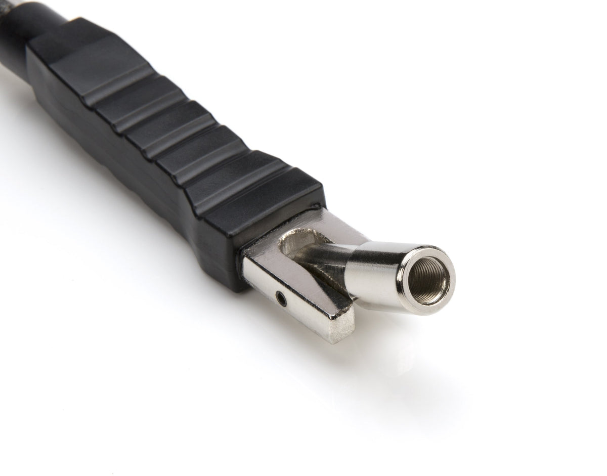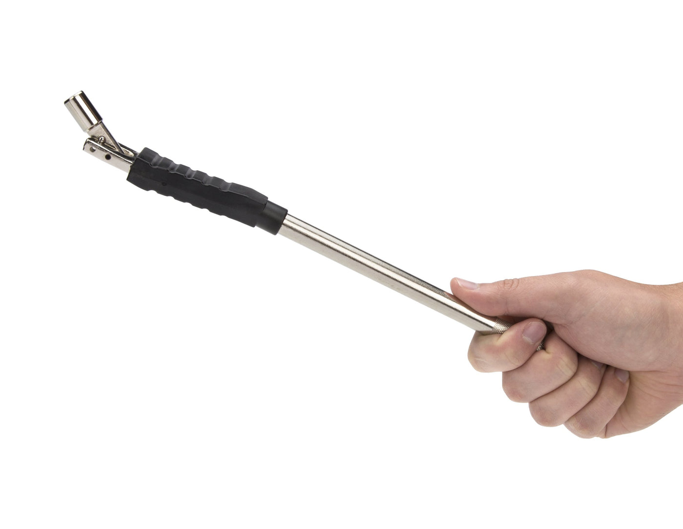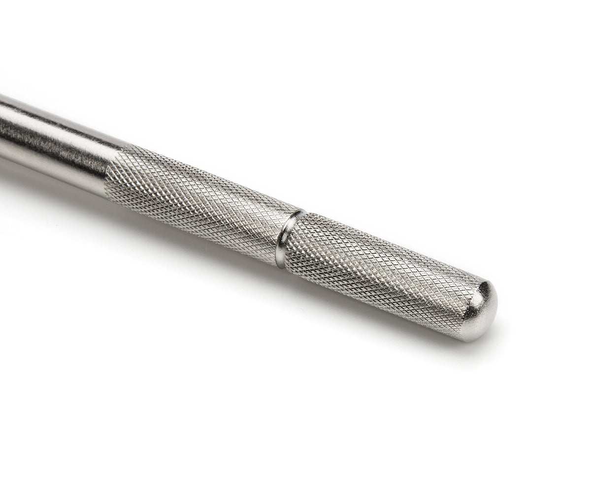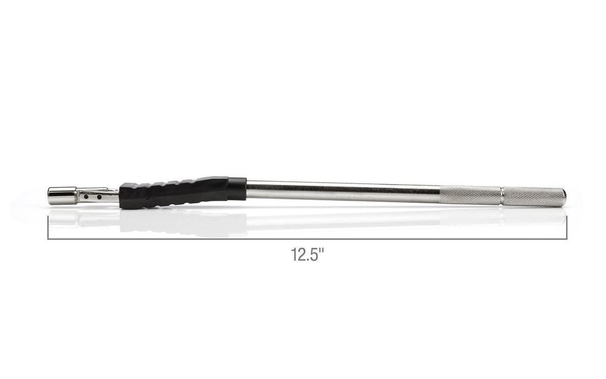 The Steelman Rubber Booted Valve Stem Puller/Installer transforms installing and removing valve stems into a hassle-free process. Its sleek steel body features a knurled handle to provide a secure, non-slip grip, and an over-molded rubber boot protects wheels and rims from possible damage. The tool's threaded head pivots to provide leverage against the rim of the wheel and is designed to safely navigate most aftermarket wheels and rims. The swivel head screws onto the cap thread for installing and removing valve stems without removing the core. The tool is compatible with all tubeless style tires, from cars and trucks to motorcycles and ATVs. At 12.5 inches long, this puller provides all the leverage necessary to remove stubborn valve stems. Whether you're a professional or home mechanic, you'll come to rely on this time-saving tool.