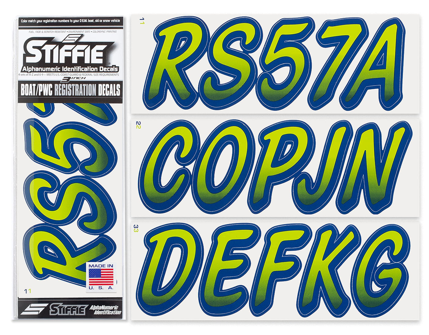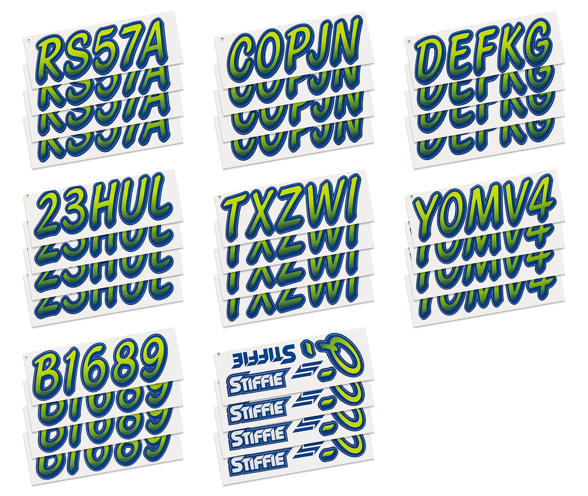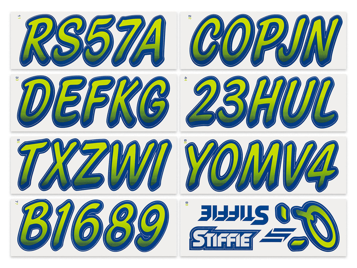 The STIFFIE Whipline Alpha Numeric Identification Kit remains our premiere boat registration numbers and letters decals style since 1992. It is a two-color design that features a forward-facing slant with smooth, rounded edges and a bold drop shadow type outline in a contrasting color. If style and cool factor is as important to you as functionality then this style is probably for you. The STIFFIE Whipline curvaceous style is available in 120 standard colors and 21 Super-Sticky colors for use with LSE (Low Surface Energy) plastic surfaces such as the Sea-Doo SPARK, Inflatable Boats, Ribs and Hypalon/PVC. STIFFIE boat numbers are 100% manufactured in the USA using our COLOR CLONE printing system. STIFFIE is the only registration decal manufacturer offering true color matching for your OEM Boat, Marine Vessel or Personal Watercraft. STIFFIE Alphanumeric ID kits are marine registration stickers for all water vessels, boats, personal watercraft. Our decals can also be used for DOT identifier number placement (Department of Transportation), snowmobile registration, or any application that requires the permanent identification or marking of name or number. Our decals are offered in styles and color ways that match your vessels original equipment manufacturer (OEM) color and design scheme. All Alphanumeric ID Kits offered by STIFFIE come with characters that are 3'' in height and meet or exceed US Coast Guard Regulations. Every ID kit comes with 4 sets of 0-9 and A-Z decals (146 total decals). STIFFIE Alphanumeric registration decals are made to withstand contact with chemicals, fading, curling, tearing and scratching. STIFFIE decals are also UV Coated for protection from harmful ultra-violet (UV) rays. Application is easy; just peel away the decals from their backing and apply. If you are not sure which color or design will best match your vessel, please give us a call.