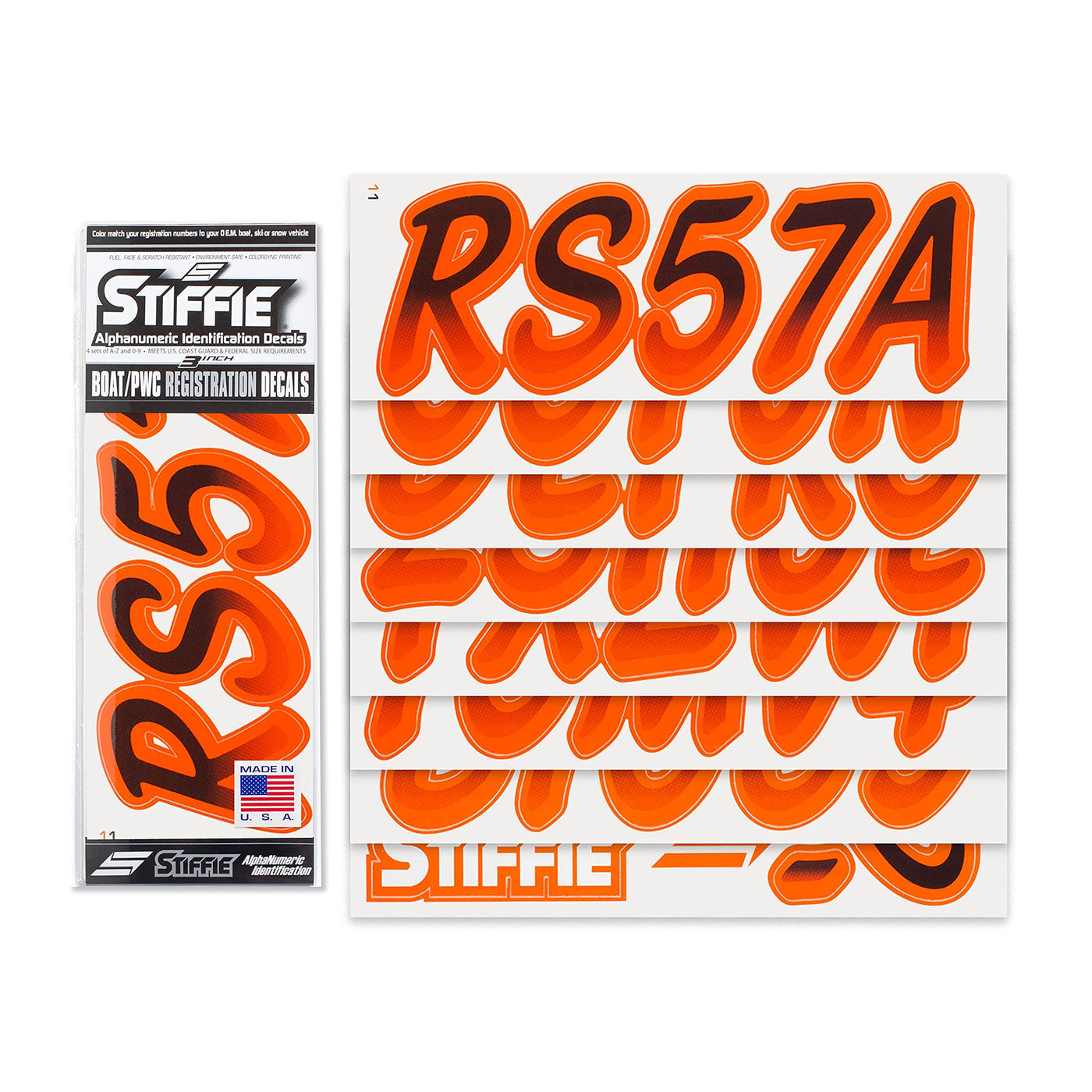 The STIFFIE Whipline Alpha Numeric Identification Kit remains our premiere boat registration numbers and letters decals style since 1992. It is a two-color design that features a forward-facing slant with smooth, rounded edges and a bold drop shadow type outline in a contrasting color. If style and cool factor is as important to you as functionality then this style is probably for you. The STIFFIE Whipline curvaceous style is available in 120 standard colors and 21 Super-Sticky colors for use with LSE (Low Surface Energy) plastic surfaces such as the Sea-Doo SPARK, Inflatable Boats, Ribs and Hypalon/PVC. STIFFIE boat numbers are 100% manufactured in the USA using our COLOR CLONE printing system. STIFFIE is the only registration decal manufacturer offering true color matching for your OEM Boat, Marine Vessel or Personal Watercraft. STIFFIE Alphanumeric ID kits are marine registration stickers for all water vessels, boats, personal watercraft. Our decals can also be used for DOT identifier number placement (Department of Transportation), snowmobile registration, or any application that requires the permanent identification or marking of name or number. Our decals are offered in styles and color ways that match your vessels original equipment manufacturer (OEM) color and design scheme. All Alphanumeric ID Kits offered by STIFFIE come with characters that are 3'' in height and meet or exceed US Coast Guard Regulations. Every ID kit comes with 4 sets of 0-9 and A-Z decals (146 total decals). STIFFIE Alphanumeric registration decals are made to withstand contact with chemicals, fading, curling, tearing and scratching. STIFFIE decals are also UV Coated for protection from harmful ultra-violet (UV) rays. Application is easy; just peel away the decals from their backing and apply. If you are not sure which color or design will best match your vessel, please give us a call.