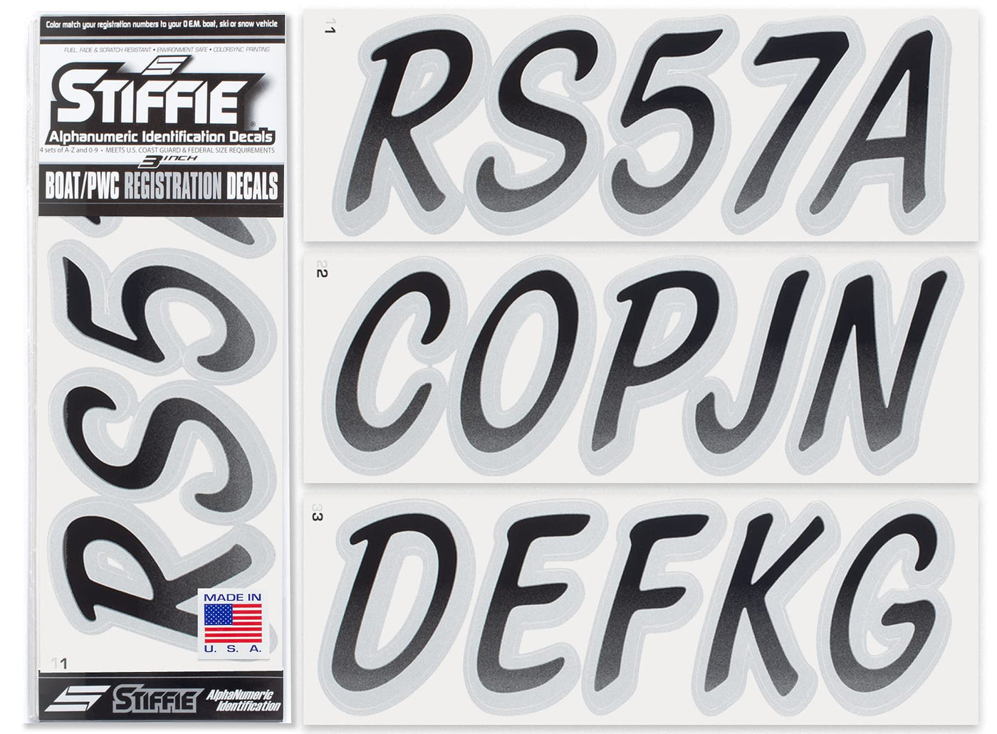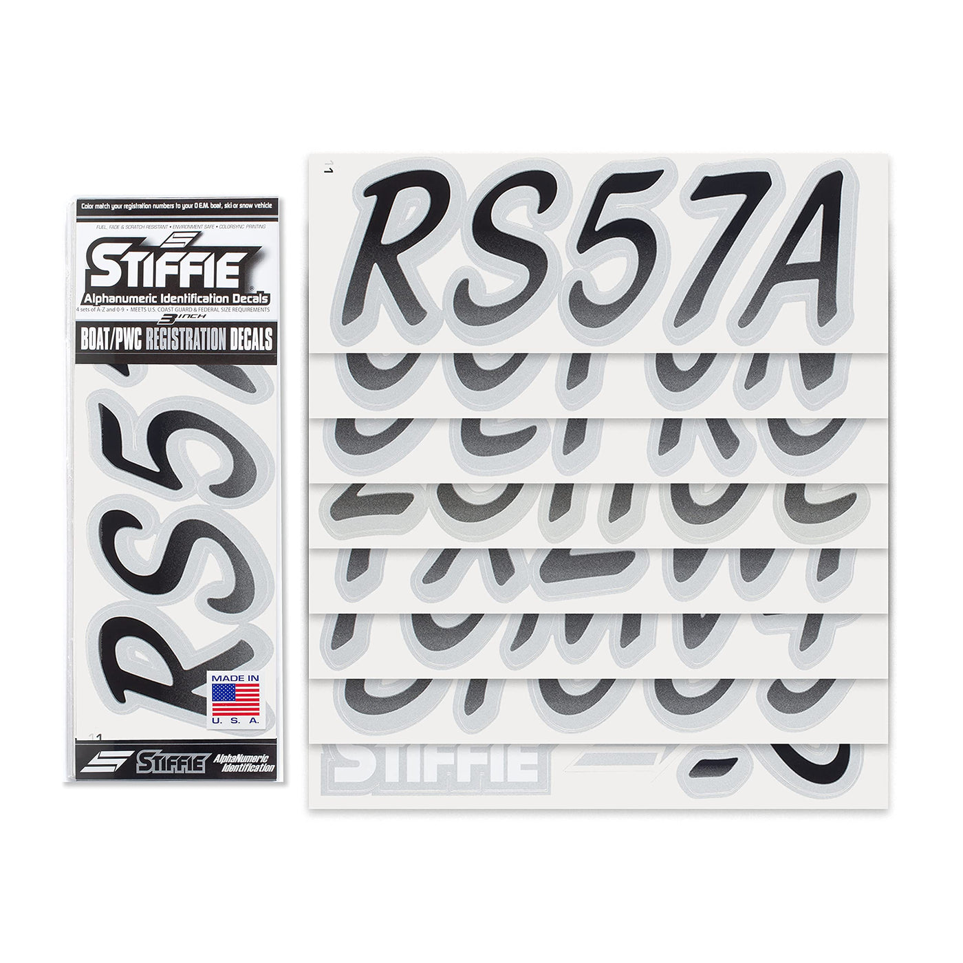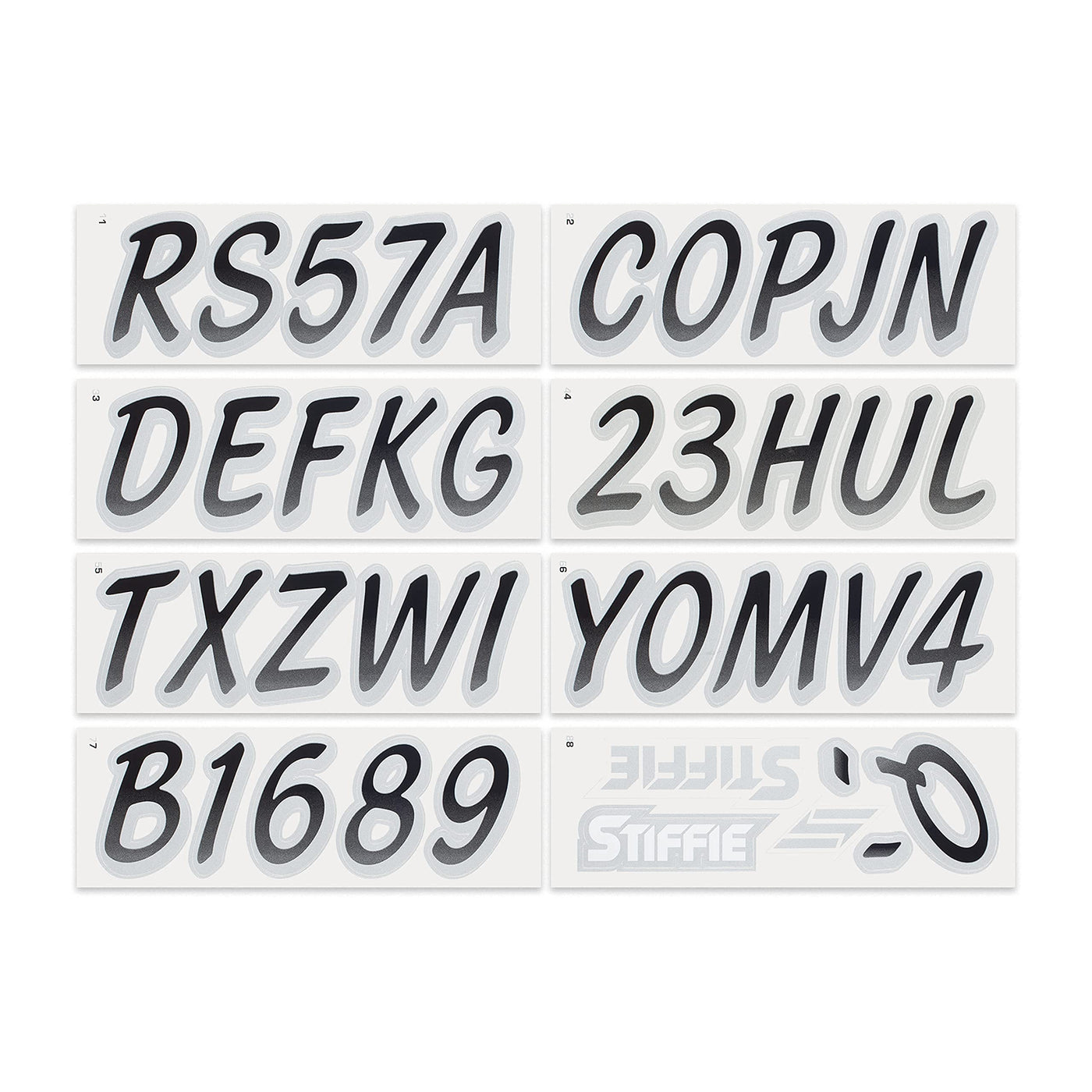 The STIFFIE Whipline Alpha Numeric Identification Kit remains our premiere boat registration numbers and letters decals style since 1992. It is a two-color design that features a forward-facing slant with smooth, rounded edges and a bold drop shadow type outline in a contrasting color. If style and cool factor is as important to you as functionality then this style is probably for you. The STIFFIE Whipline curvaceous style is available in 120 standard colors and 21 Super-Sticky colors for use with LSE (Low Surface Energy) plastic surfaces such as the Sea-Doo SPARK, Inflatable Boats, Ribs and Hypalon/PVC. STIFFIE boat numbers are 100% manufactured in the USA using our COLOR CLONE printing system. STIFFIE is the only registration decal manufacturer offering true color matching for your OEM Boat, Marine Vessel or Personal Watercraft. STIFFIE Alphanumeric ID kits are marine registration stickers for all water vessels, boats, personal watercraft. Our decals can also be used for DOT identifier number placement (Department of Transportation), snowmobile registration, or any application that requires the permanent identification or marking of name or number. Our decals are offered in styles and color ways that match your vessels original equipment manufacturer (OEM) color and design scheme. All Alphanumeric ID Kits offered by STIFFIE come with characters that are 3'' in height and meet or exceed US Coast Guard Regulations. Every ID kit comes with 4 sets of 0-9 and A-Z decals (146 total decals). STIFFIE Alphanumeric registration decals are made to withstand contact with chemicals, fading, curling, tearing and scratching. STIFFIE decals are also UV Coated for protection from harmful ultra-violet (UV) rays. Application is easy; just peel away the decals from their backing and apply. If you are not sure which color or design will best match your vessel, please give us a call.