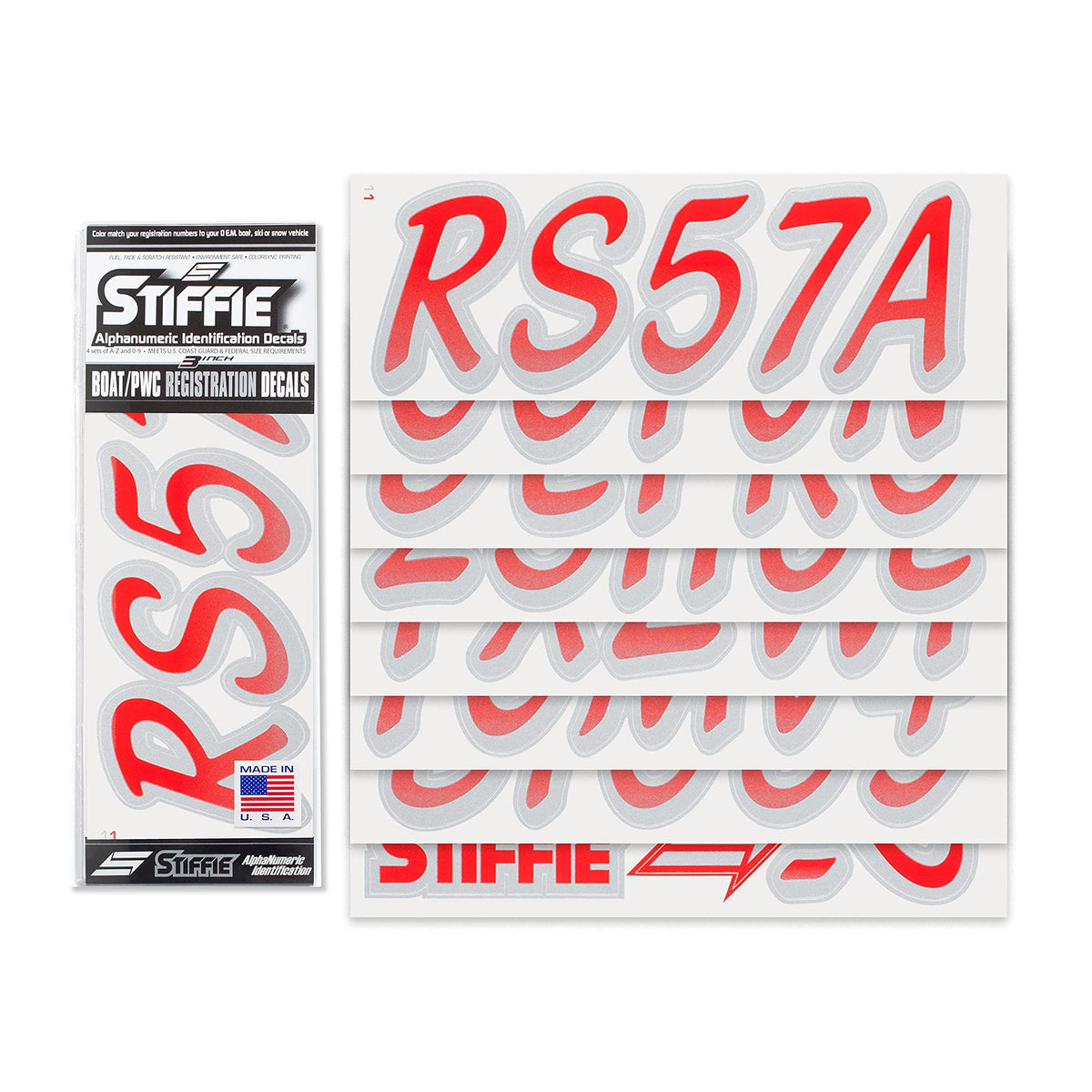 The STIFFIE Whipline Alpha Numeric Identification Kit remains our premiere boat registration numbers and letters decals style since 1992. It is a two-color design that features a forward-facing slant with smooth, rounded edges and a bold drop shadow type outline in a contrasting color. If style and cool factor is as important to you as functionality then this style is probably for you. The STIFFIE Whipline curvaceous style is available in 120 standard colors and 21 Super-Sticky colors for use with LSE (Low Surface Energy) plastic surfaces such as the Sea-Doo SPARK, Inflatable Boats, Ribs and Hypalon/PVC. STIFFIE boat numbers are 100% manufactured in the USA using our COLOR CLONE printing system. STIFFIE is the only registration decal manufacturer offering true color matching for your OEM Boat, Marine Vessel or Personal Watercraft. STIFFIE Alphanumeric ID kits are marine registration stickers for all water vessels, boats, personal watercraft. Our decals can also be used for DOT identifier number placement (Department of Transportation), snowmobile registration, or any application that requires the permanent identification or marking of name or number. Our decals are offered in styles and color ways that match your vessels original equipment manufacturer (OEM) color and design scheme. All Alphanumeric ID Kits offered by STIFFIE come with characters that are 3'' in height and meet or exceed US Coast Guard Regulations. Every ID kit comes with 4 sets of 0-9 and A-Z decals (146 total decals). STIFFIE Alphanumeric registration decals are made to withstand contact with chemicals, fading, curling, tearing and scratching. STIFFIE decals are also UV Coated for protection from harmful ultra-violet (UV) rays. Application is easy; just peel away the decals from their backing and apply. If you are not sure which color or design will best match your vessel, please give us a call.