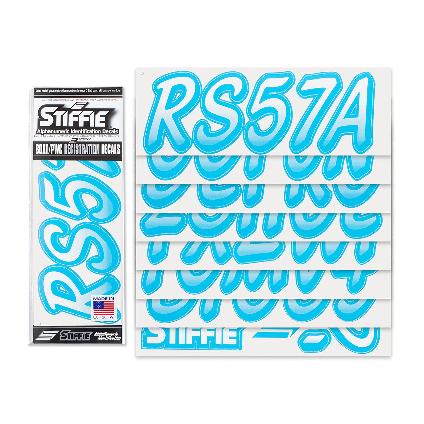 The STIFFIE Whipline Alpha Numeric Identification Kit remains our premiere boat registration numbers and letters decals style since 1992. It is a two-color design that features a forward-facing slant with smooth, rounded edges and a bold drop shadow type outline in a contrasting color. If style and cool factor is as important to you as functionality then this style is probably for you. The STIFFIE Whipline curvaceous style is available in 120 standard colors and 21 Super-Sticky colors for use with LSE (Low Surface Energy) plastic surfaces such as the Sea-Doo SPARK, Inflatable Boats, Ribs and Hypalon/PVC. STIFFIE boat numbers are 100% manufactured in the USA using our COLOR CLONE printing system. STIFFIE is the only registration decal manufacturer offering true color matching for your OEM Boat, Marine Vessel or Personal Watercraft. STIFFIE Alphanumeric ID kits are marine registration stickers for all water vessels, boats, personal watercraft. Our decals can also be used for DOT identifier number placement (Department of Transportation), snowmobile registration, or any application that requires the permanent identification or marking of name or number. Our decals are offered in styles and color ways that match your vessels original equipment manufacturer (OEM) color and design scheme. All Alphanumeric ID Kits offered by STIFFIE come with characters that are 3'' in height and meet or exceed US Coast Guard Regulations. Every ID kit comes with 4 sets of 0-9 and A-Z decals (146 total decals). STIFFIE Alphanumeric registration decals are made to withstand contact with chemicals, fading, curling, tearing and scratching. STIFFIE decals are also UV Coated for protection from harmful ultra-violet (UV) rays. Application is easy; just peel away the decals from their backing and apply. If you are not sure which color or design will best match your vessel, please give us a call.