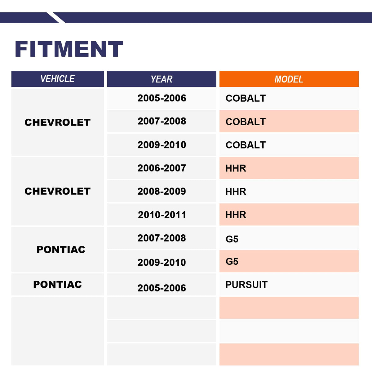 ?NOTE?: please be sure to check the product title and product description before ordering to make sure this part is suitable for your car. Fitment: Chevrolet Cobalt 2005 2006 2007 2008 2009 2010 Chevrolet HHR 2006 2007 2008 2009 2010 2011 Pontiac G5 2007 2008 2009 2010 Pontiac Pursuit 2005 2006 Replaces Part Numbers: K750012 Please pay attention before purchase (main reasons for return) 1. Please confirm the OE Part number matches. 2. Please confirm the installation location matches your model. 3. Please confirm whether your car is in the adaptation list.