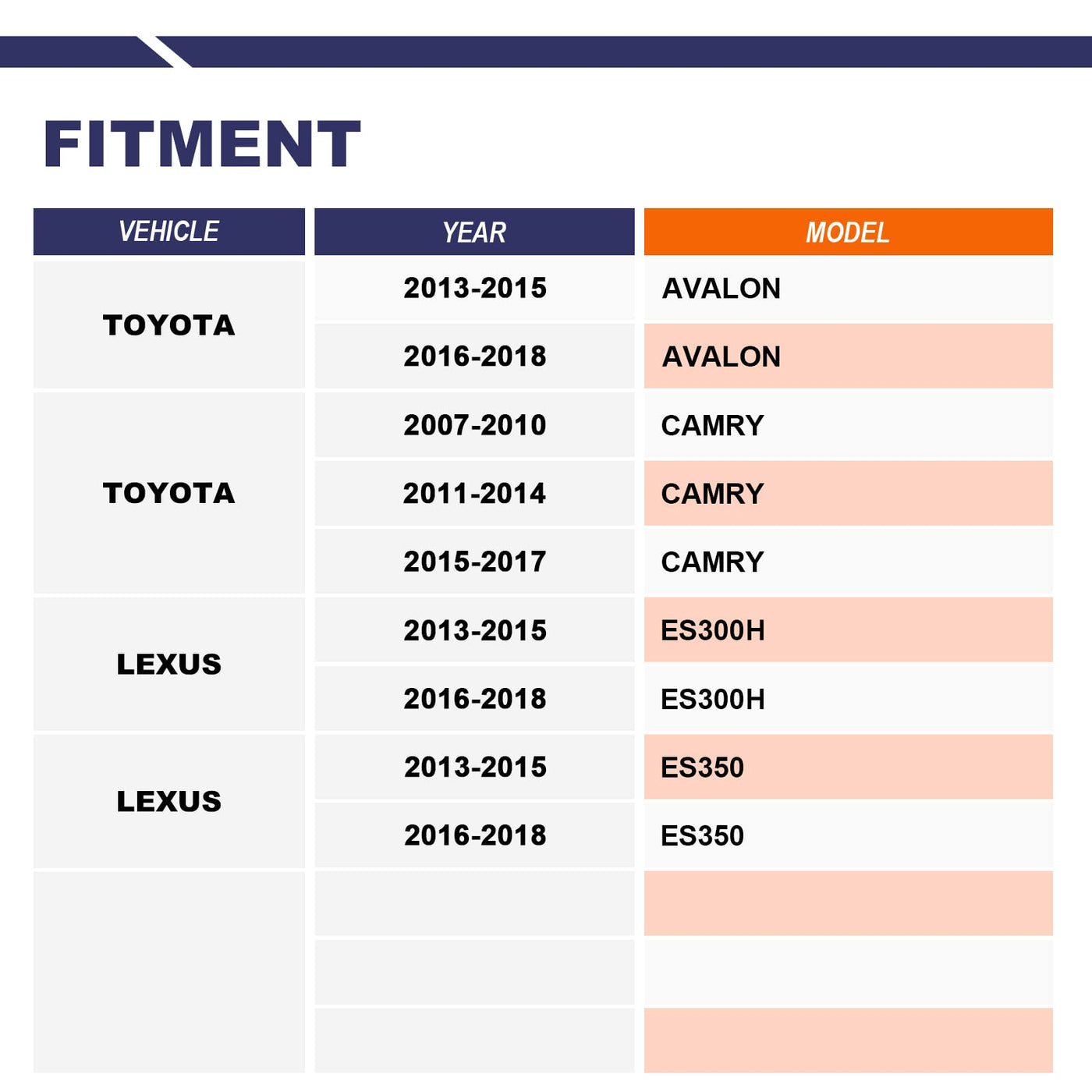 ?NOTE?: please be sure to check the product title and product description before ordering to make sure this part is suitable for your car. Fitment: TOYOTA AVALON 2013 - 2018 All Models TOYOTA CAMRY 2007 - 2017 All Models LEXUS ES300h 2013 - 2018 All Models LEXUS ES350 2013 - 2018 All Models Replaces Part Numbers: k750123