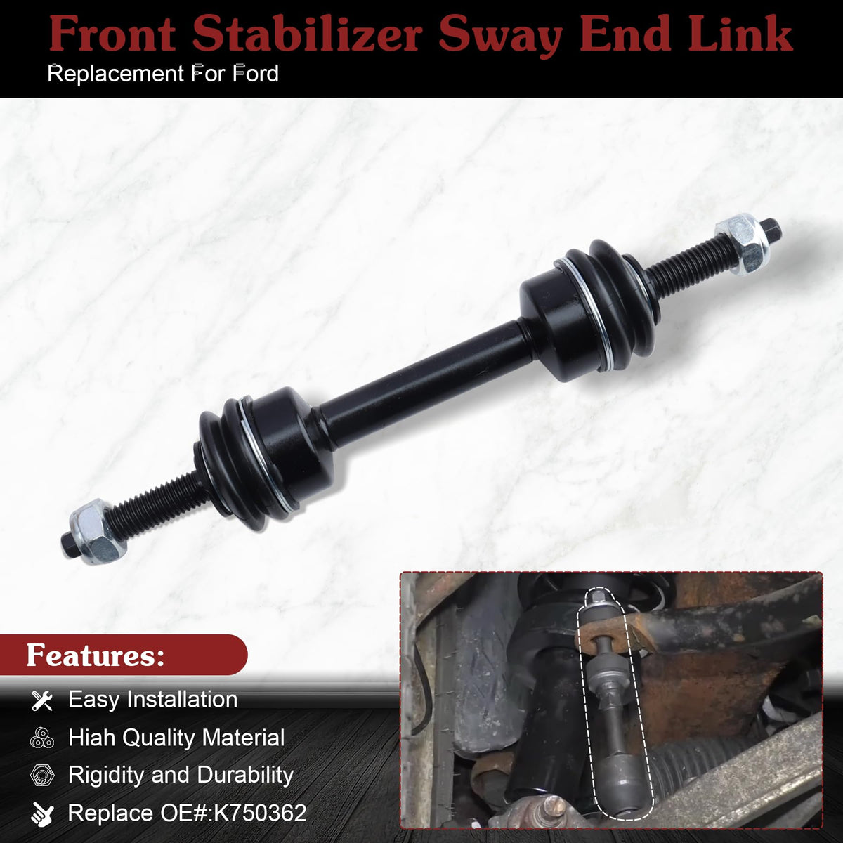 ?Fitment?Sway Bar Link compatible with 2009-2018 F-150?2010-2019 F-250/F-350 Super Duty?2009-2019 F-450 Super Duty?2009-2018 F-550 Super Duty | ?Replacement part number?Front Stabilizer End Link Rerlaces#K750362,536-176, 9L3Z5K483D | ?High Quality?We aim to be the best quality Sway Bar End Links manufacturer. All of our products use the highest quality raw materials.We have the advanced laboratory equipment to test products. The quality can completely replace OE Parts. | ?Better experience?There are several benefits that can be gained from a timely replacement of the sway bar end link:1.Improved handling,making the vehicle more stable and easier to control, especially during cornering.2.Better stability: making the ride smoother and more comfortable.3.Quieter ride: reduce noise and vibration, making the ride quieter and more pleasant. | ?Excellent after-sales service?We All our customers enjoy Lifetime Money Back Guarantee.Customers can return and get refund in case the purchasing is not satisfactory for any reason. We offers 24 hours quick-reply and friendly customer service.Thank you for your support.
