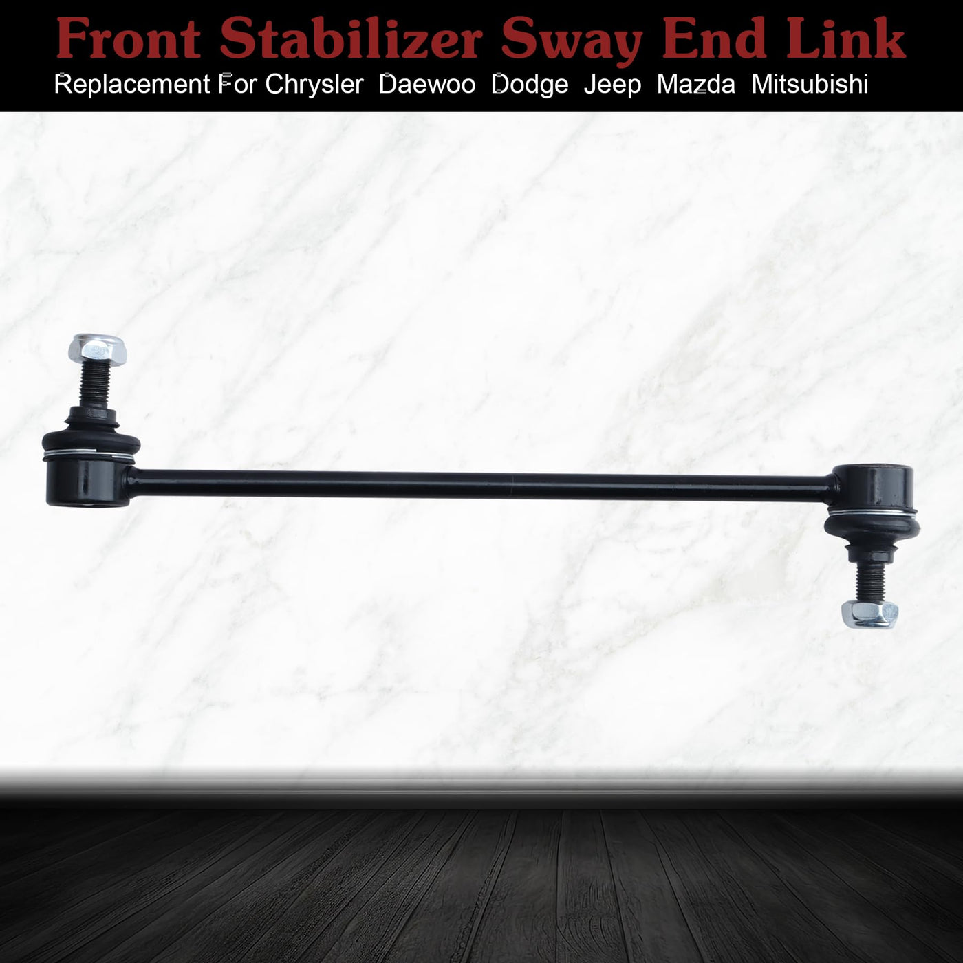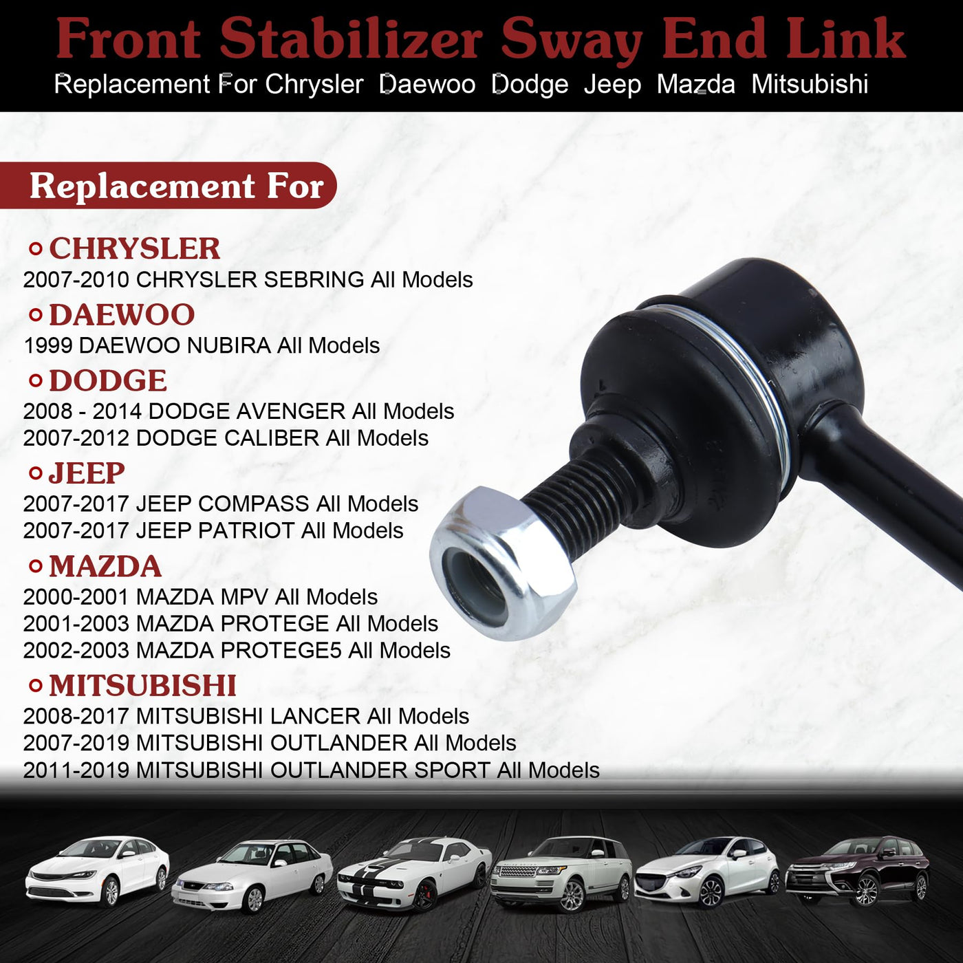 ?Fitment?Sway Bar Link compatible with 2007-2010 Chrysler Sebring?2011-2014 Chrysler 200?2007-2012 Dodge Caliber?2008-2014 Dodge Avenger?2007-2017 Jeep Patriot?2007-2017 Jeep Compass?2001-2003 Mazda Protege?2008-2015 Lancer | ?Replacement part number?Front Stabilizer End Link Rerlaces#K80258,5174185AA, 5174185AB, 517485AA, 96207628 | ?High Quality?We aim to be the best quality Sway Bar End Links manufacturer. All of our products use the highest quality raw materials.We have the advanced laboratory equipment to test products. The quality can completely replace OE Parts. | ?Better experience?There are several benefits that can be gained from a timely replacement of the sway bar end link:1.Improved handling,making the vehicle more stable and easier to control, especially during cornering.2.Better stability: making the ride smoother and more comfortable.3.Quieter ride: reduce noise and vibration, making the ride quieter and more pleasant. | ?Excellent after-sales service?We All our customers enjoy Lifetime Money Back Guarantee.Customers can return and get refund in case the purchasing is not satisfactory for any reason. We offers 24 hours quick-reply and friendly customer service.Thank you for your support.
