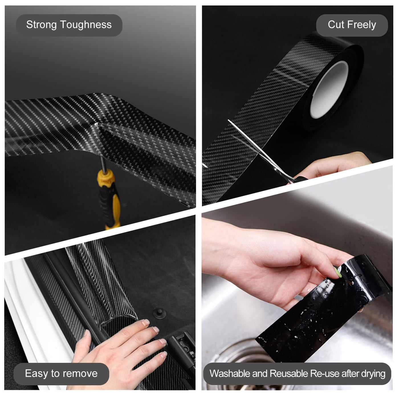 Features : Textured with a carbon fiber design, 5D carbon textured finish, the weave reflects light the same way as the actual carbon fiber. Ideal for long-term fleet and motorsport applications, economical alternative to paint. Easily removable, not damage to your car surfaces or coatings. Multiple applications: Specially engineered for DIY'ers, make your own custom emblem. Fits interior and exterior applications, can cover any smooth surface Applied to car used, boats, motorcycle parts, metal, mobile phone, laptop, furniture window molding etc Can be applied to home interiors, personal devices, DIY projects and and just about any relatively non-porous surface Basic Installation Guide: 1)Wipe down and clean the desired surface 2) Peel off adhesive backing 3) Stretch the door sill protector over the desired area 4) Remove air bubbles while applying the fiber tape 5) Work your way along in one direction and carefully reposition the vinyl if necessary 6) Use a heat gun to almost warm up the carbon fiber tape to increase flexibility 7) Press firm and apply heat to the surface to assist with adhesion 8) Carefully trim the edges of the vinyl and tuck in the remaining edges to ensure a nice seal