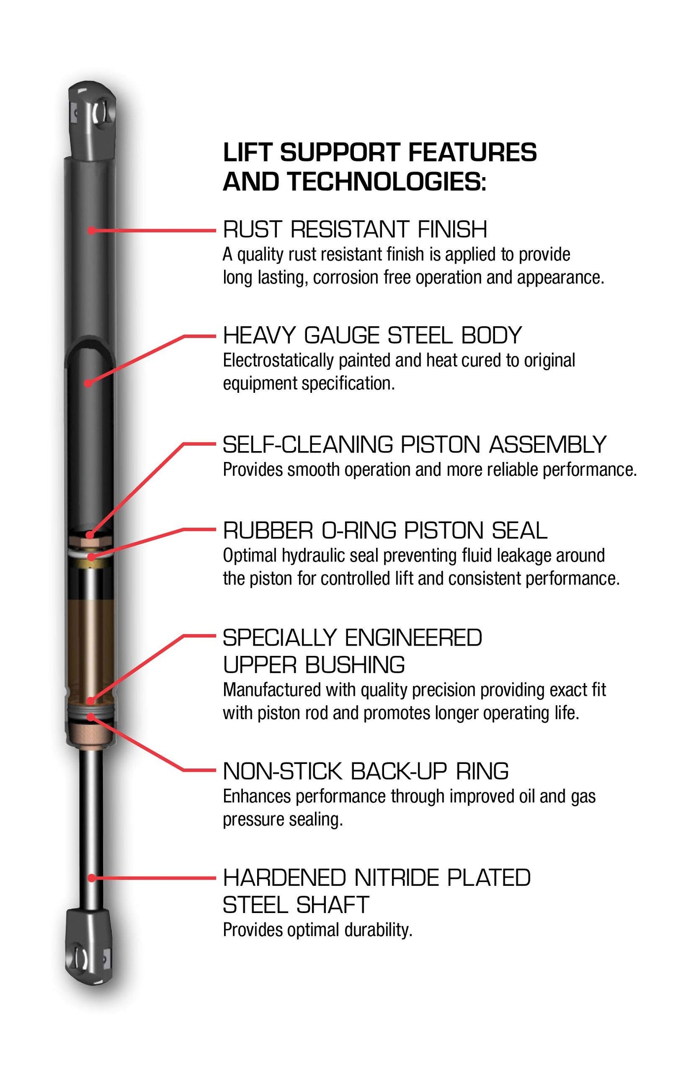 Lift Supports Are Pressurized Cylinders That Are Used To Support Hoods, Hatches And Rear Window Glass In Automotive Applications. Lift Supports Are Also Used In Many Non-Automotive Applications. Each Strongarm Lift Support Is Custom Engineered, And Manufactured Beyond Industry Standards To Provide Smoother Operating, And Longer Lasting Performance. Lift Supports Should Be Replaced In Pairs To Ensure Safe, Reliable Support Of Your Hood, Hatch, Or Liftgate.