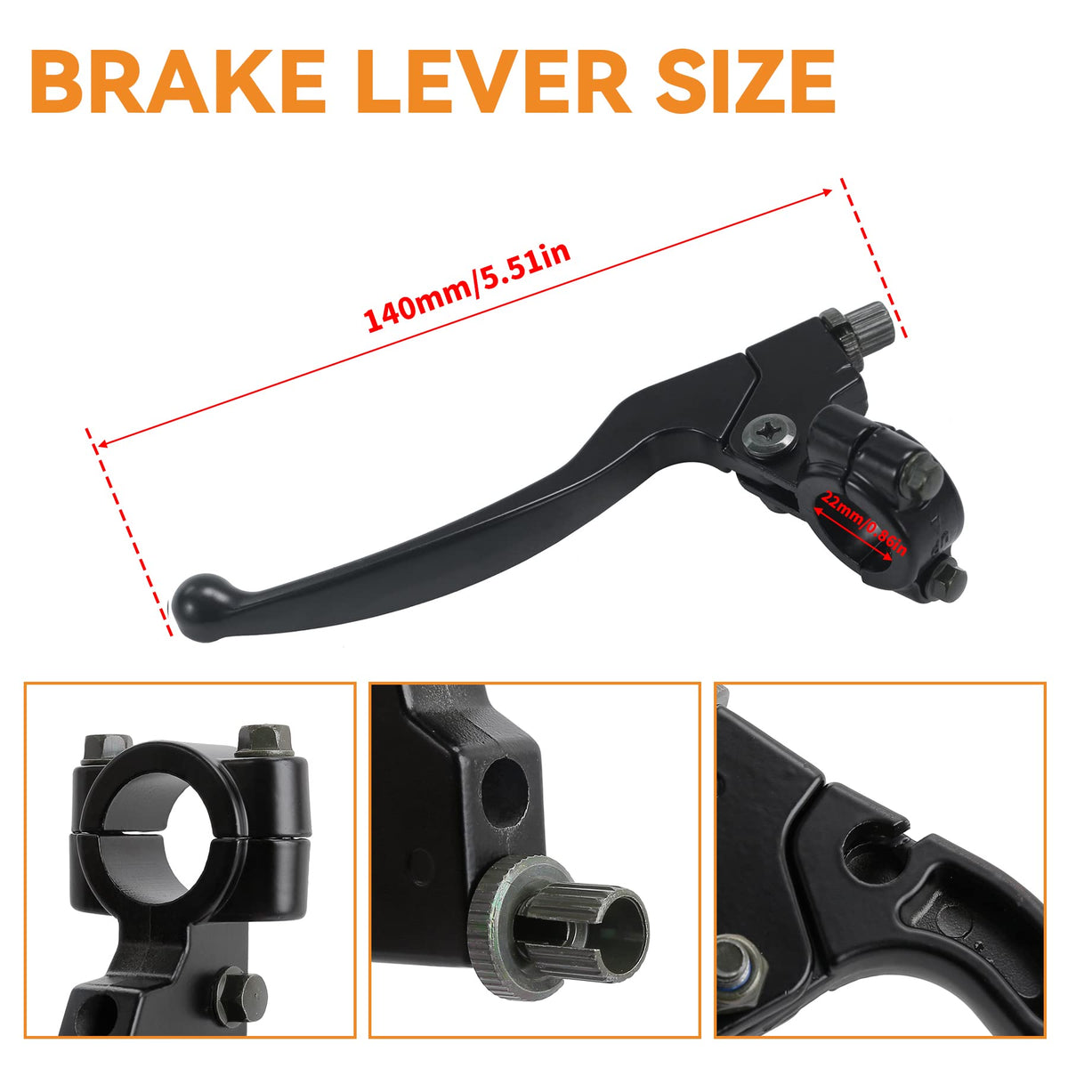 Q: What are the dimensions and specifications of the clutch lever and cable?A: The Left Clutch Lever has a handle length of 140mm and a mounting hole diameter of 22mm (7/8 inch). The Clutch Cable measures 990mm in length with a cable moving length of 90mm, ensuring a perfect fit for any 7/8 inch handlebar.