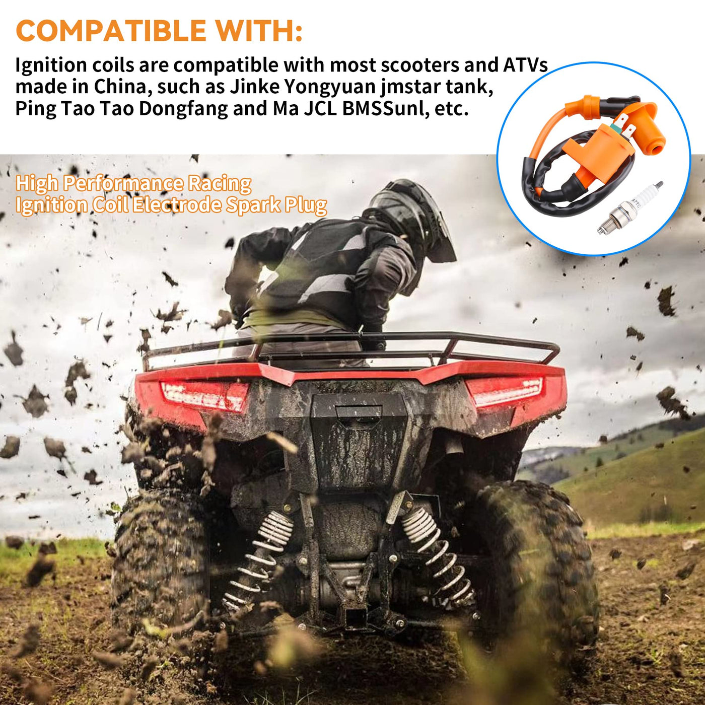 Stylemafia High Performance Racing Ignition Coil Electrode Spark Plug fit for GY6 50cc 150cc 125cc 150cc Chinese ATV Moped Scooter ATV Go Kart Parts Perfect match:100% Brand New High Performance Racing Ignition Coil + Spark Plug.Ignition coil Compatible with most of Chinese Made Scooters and ATV Such as Kymco Jonway jmstar tank peace TaoTao Dongfang Kazuma JCL BMSSunl etc. Racing Ignition coil Compatible with Chinese GY6 50cc - 110cc 125cc 150cc 4-stroke Engines Scooters ATVs Go Karts Mopeds Quad Pit Bikes Dirt Bikes. Racing Ignition coil surface finish: plastic;Color: Orange;Overall length:19''.Racing Ignition coil comes triple electrode head Spark plug,Pretty easy to install and durable. Packing included: 1 x Ignition Coil ,1xSpark Plug as images display Professional after-sales:Please check the description to confirm the compatibility before purchase. Thank you! if you have any problems or concerns, please kindly send us mail any time, we are always here to provide you 100% satisfied after-sale service.