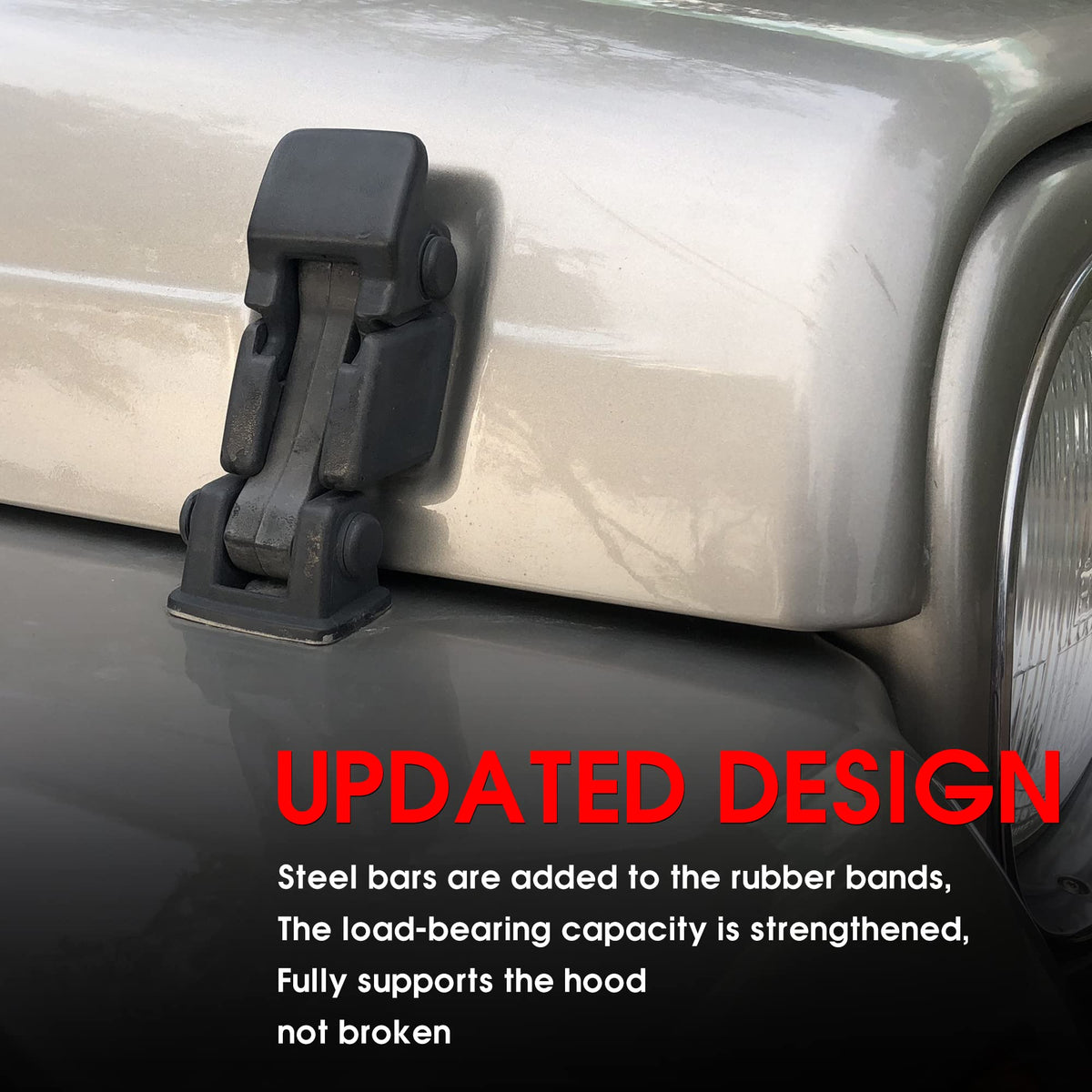 Fitment: Hood latches kit fit for 1997 1998 1999 2000 2001 2002 2003 2004 2005 2006 Jeep Wrangler tj accessories Package includes: 2X Hood Lock (left and right) for Jeep Wrangler Accessories TJ Size: As the picture shown Color: Black Material: Polyamide + Stainless Steel Weight: 400g Update: Steel bars are added to the rubber bands, The load-bearing capacity is strengthened, Fully supports the hood, not broken. Features: Hood latch kit is made of High Quality Polyamide & Stainless Steel. Hood catch kit keep Your Hood Stay in Place Even Over Demanding Terrain For Jeep wrangler tj hood latches is Original Factory Designed. Direct Replacement. No Drilling Required