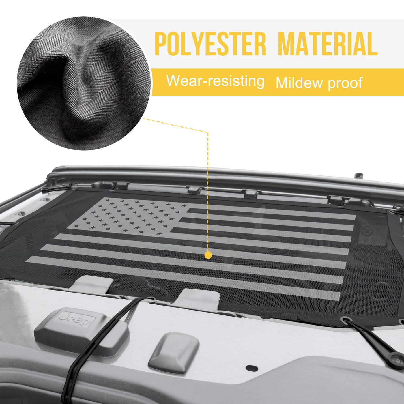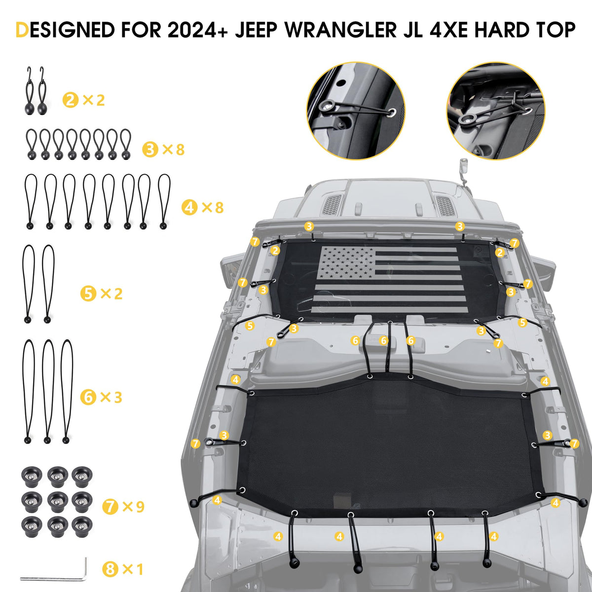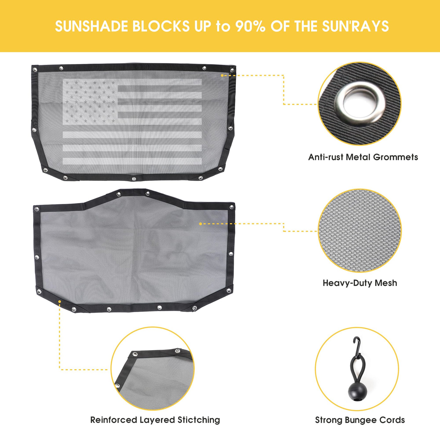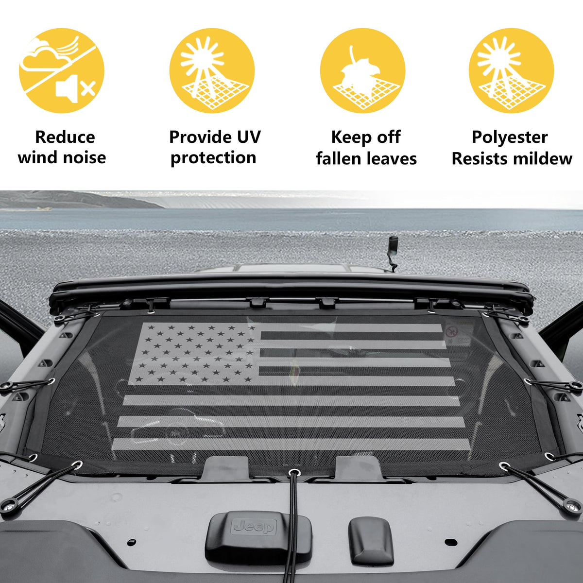 Get ample shade to prevent UV rays and direct sunlight by using Sukemichi fit for 2024 2025 Jeep Wrangler Mesh Shade Top. reduce wind and driving noise while provide you open view experience, let you enjoy the summer cross-country fun. Feature: Custom made for 2024 2025 Jeep Wrangler accessories 4 door Full length mesh top Resists Flapping and Billowing Provides up to 80% UV protection Uses bungee cords mounting system Compatible with both soft and hard tops Easy Installation ?? Package Include: -2 PCS for 2024 2025 Jeep wrangler sun shade top 4 door - 1 set of necessary bungee cords