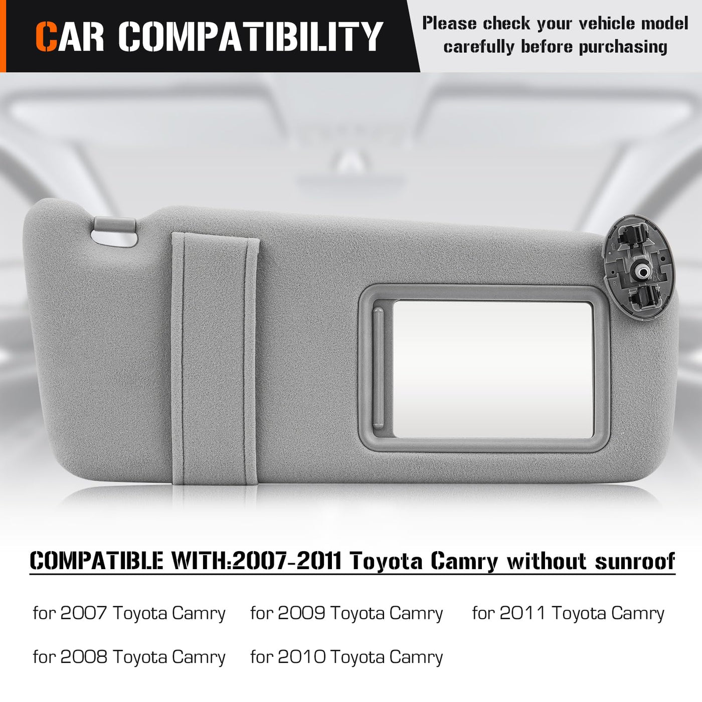Note: Right passenger side sun visor Gray, without light, without sunroof Right Passenger Side Sun Visor Compatible with: for 2007-2011 Toyota Camry Measure: 7.5 x 16.1 x 2.0 inches, weighs 1.15 BL Replace for part number: 74310-06750-E0 Package: 1 X Right passenger side sun visor